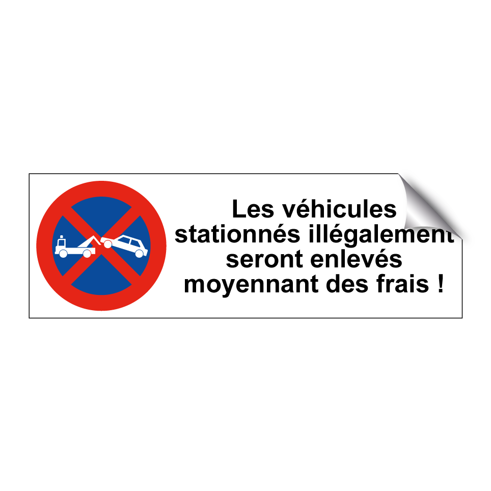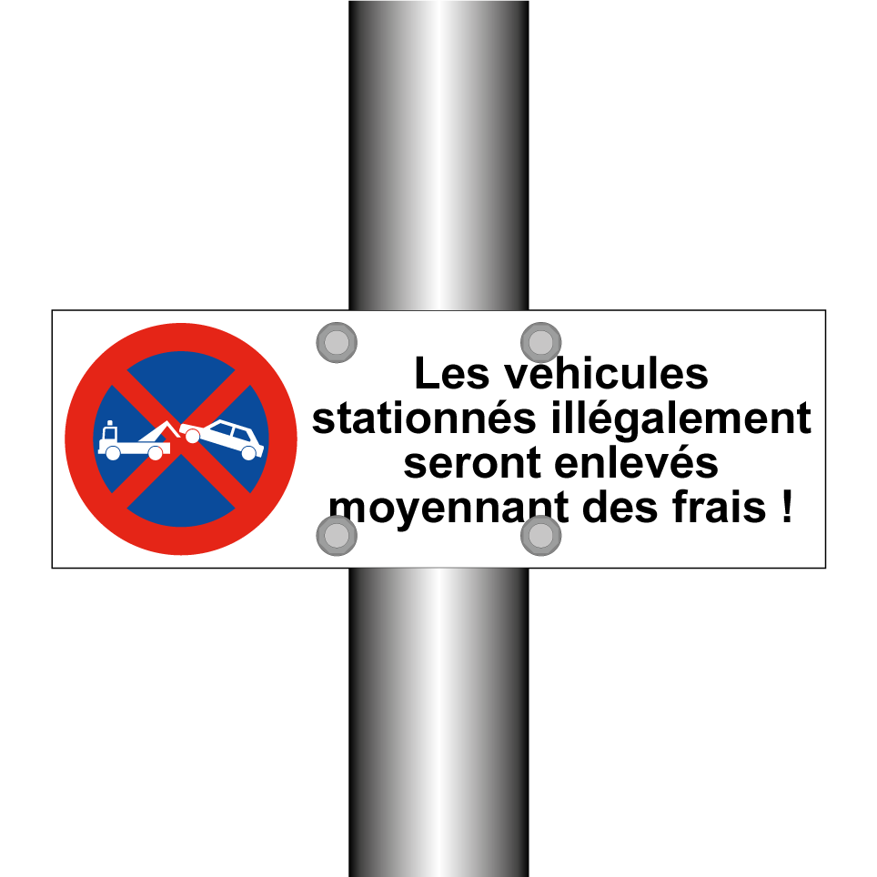 Panneau d'interdiction de stationner avec le texte : "Les véhicules stationnés illégalement seront enlevés moyennant des frais !" et une symbolique claire.