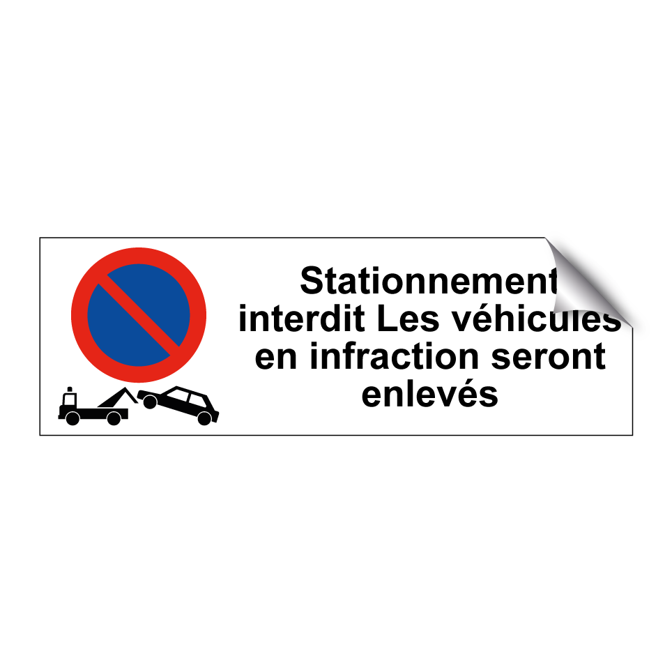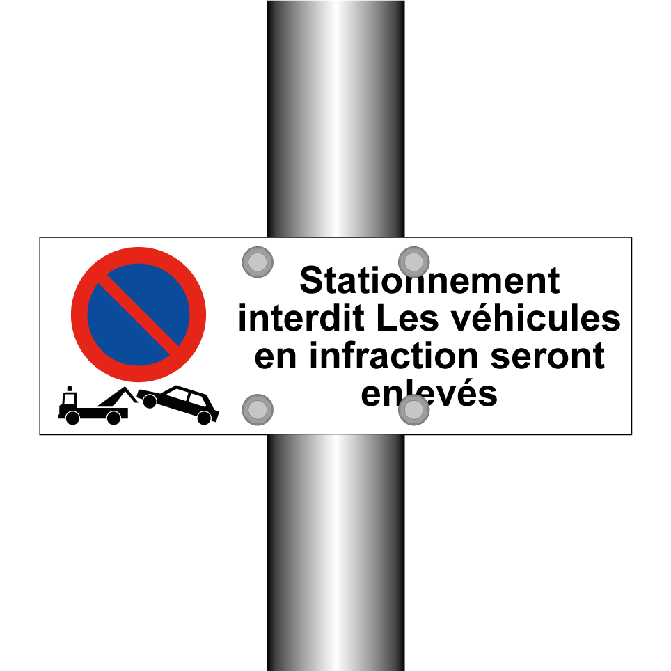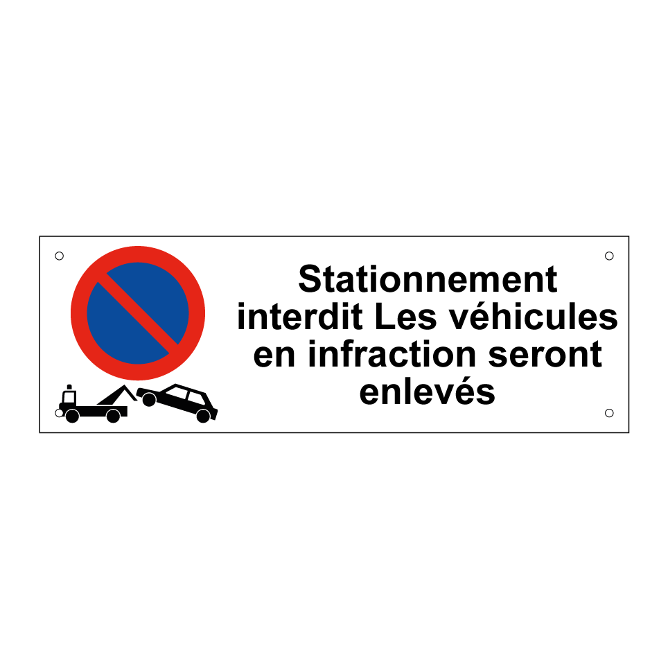 Panneau d'interdiction de stationner avec le texte : "Stationnement interdit Les véhicules en infraction seront enlevés" et une symbolique claire.