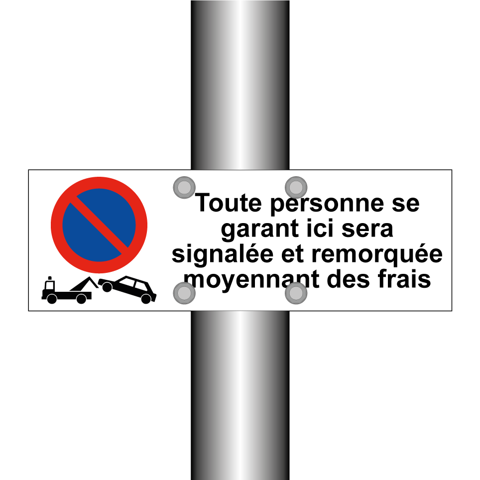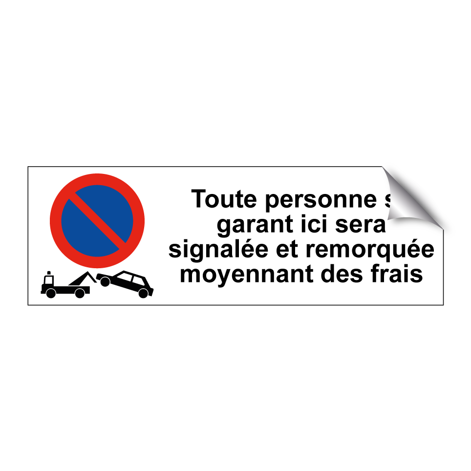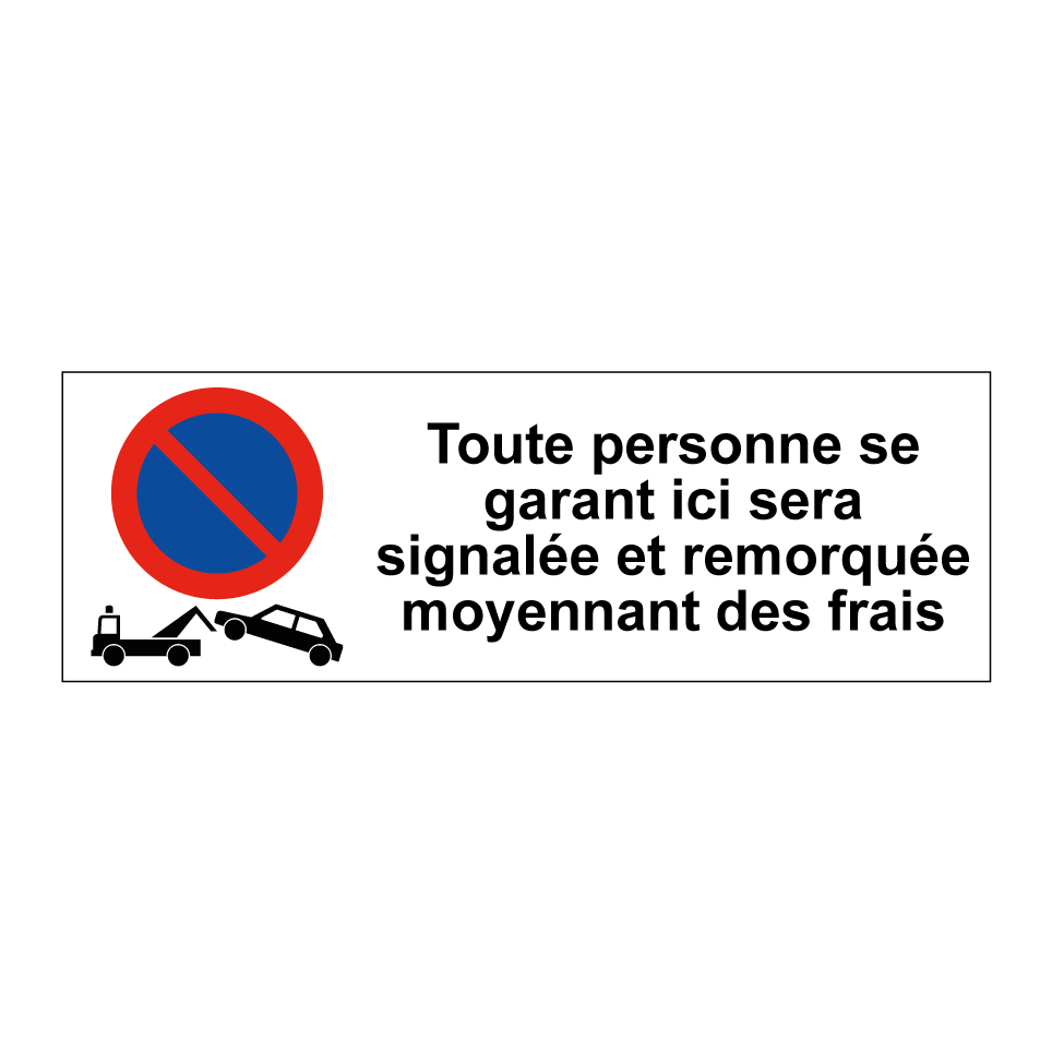 Panneau d'interdiction de stationner avec le texte : "Toute personne se garant ici sera signalée et remorquée moyennant des frais" et une symbolique claire.