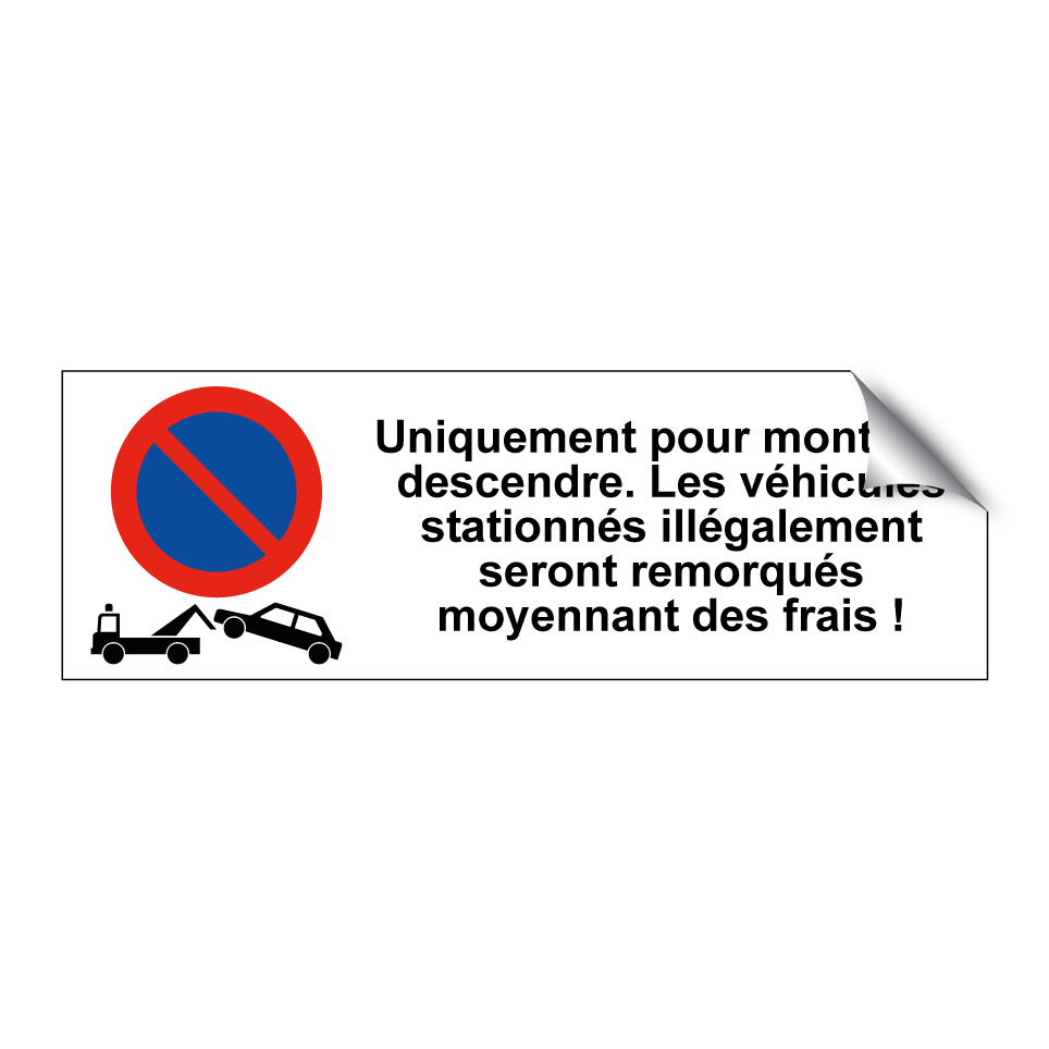 Panneau d'interdiction de stationner avec le texte : "Uniquement pour monter et descendre. Les véhicules stationnés illégalement seront remorqués moyennant des frais !" et une symbolique claire.