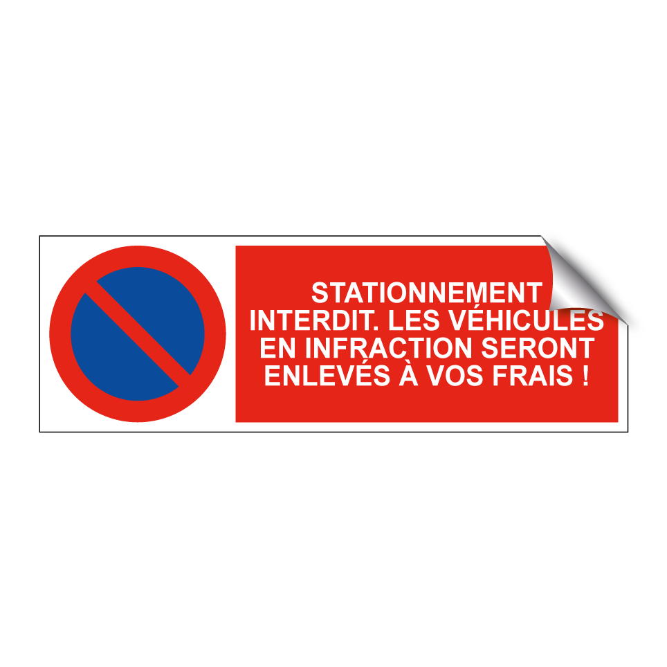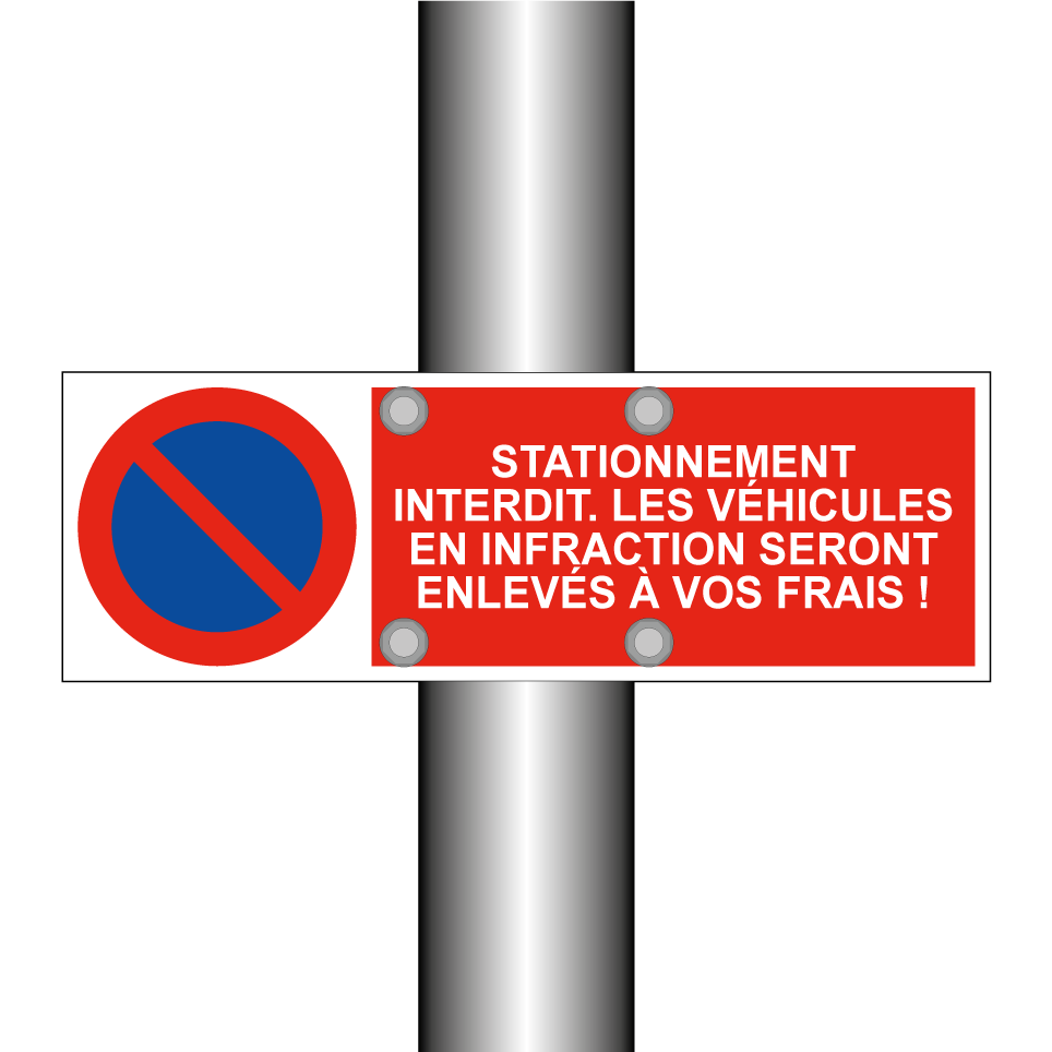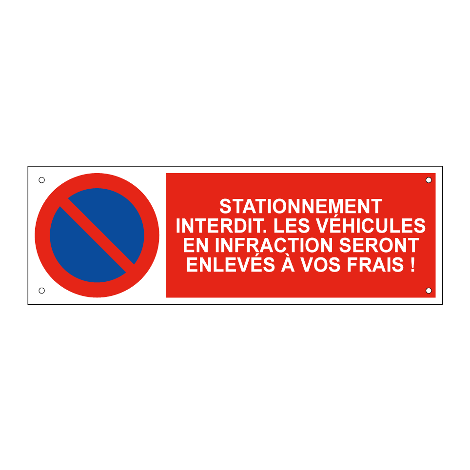 Panneau d'interdiction de stationner avec le texte : "Stationnement interdit. Les véhicules en infraction seront enlevés à vos frais !" et une symbolique claire.
