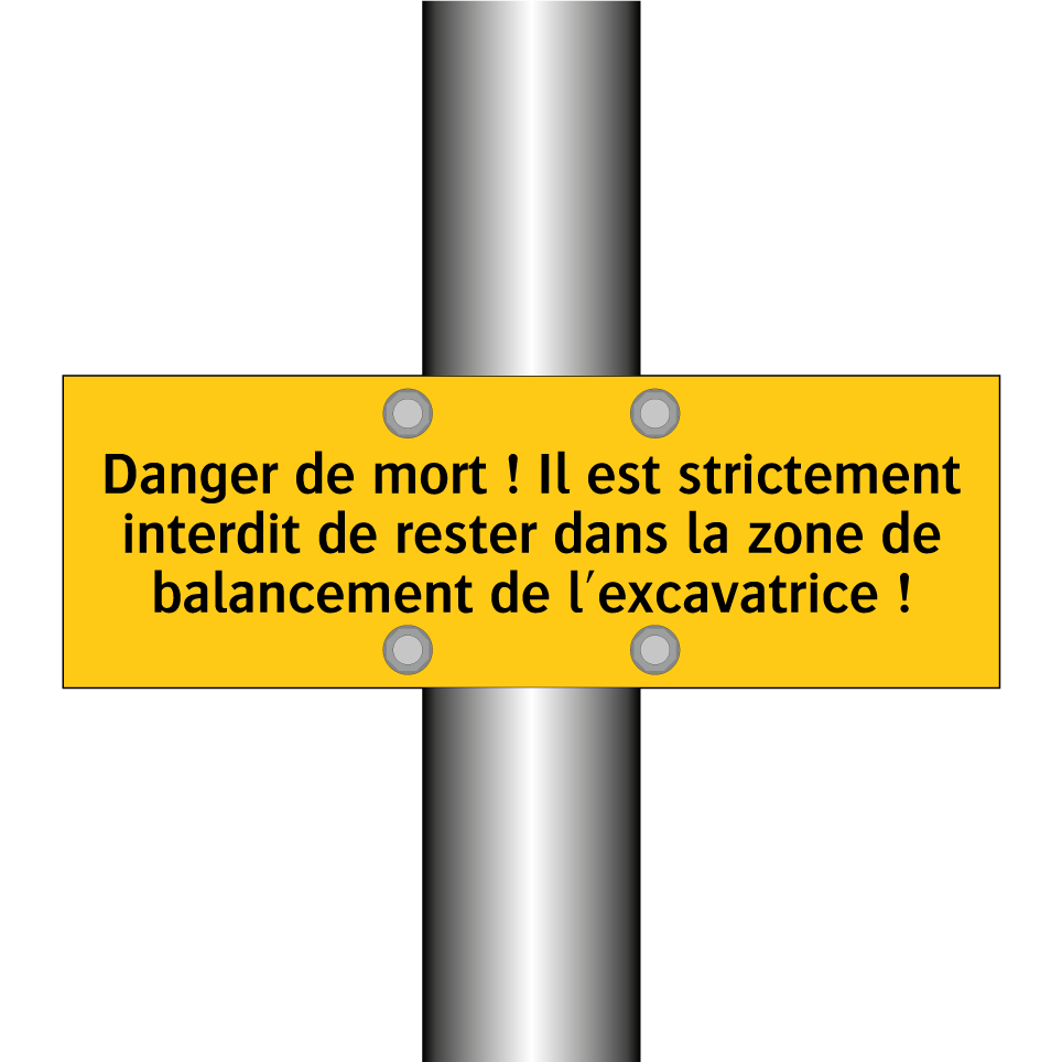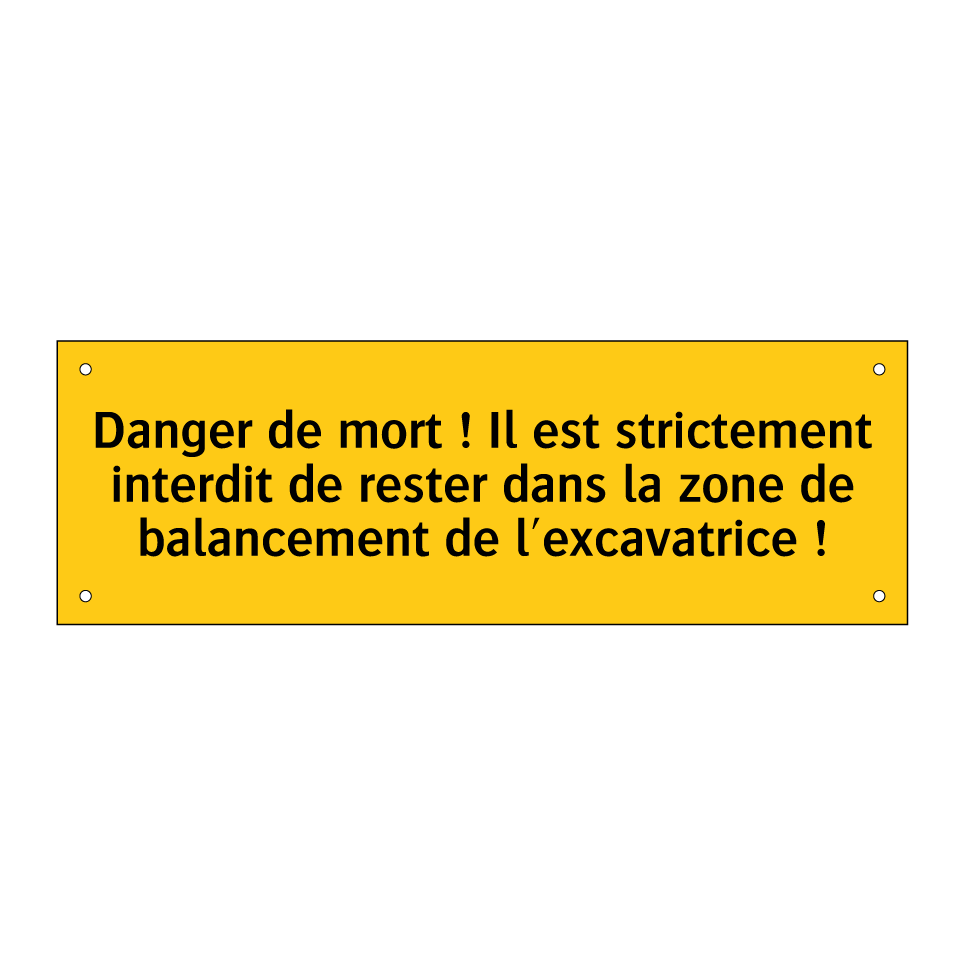 Panneau d'avertissement avec le texte : "Danger de mort ! Il est strictement interdit de rester dans la zone de balancement de l'excavatrice !"