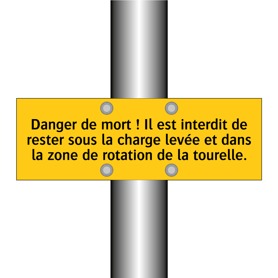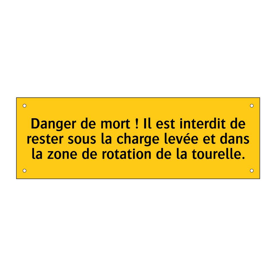 Panneau d'avertissement avec le texte : "Danger de mort ! Il est interdit de rester sous la charge levée et dans la zone de rotation de la tourelle"