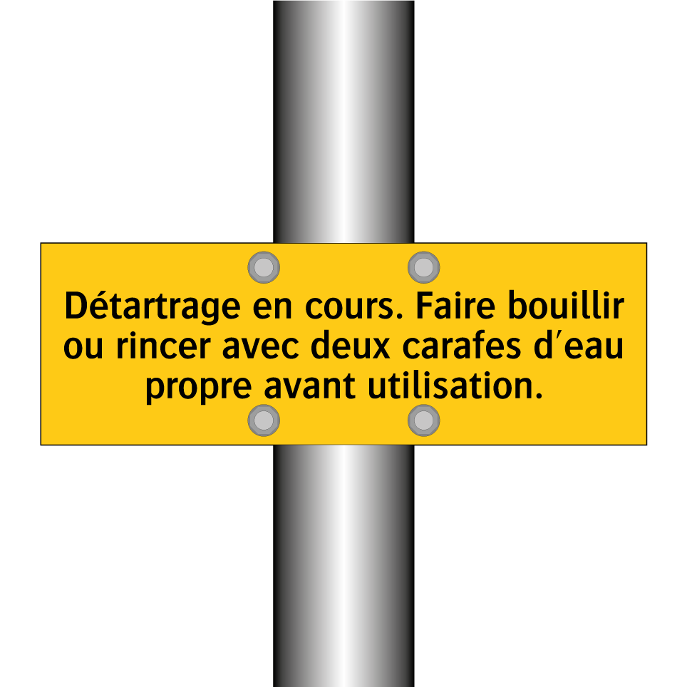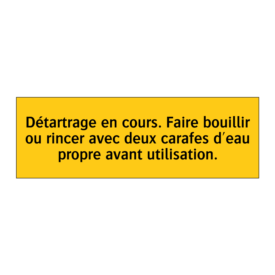 Panneau d'avertissement avec le texte : "Détartrage en cours. Faire bouillir ou rincer avec deux carafes d'eau propre avant utilisation"