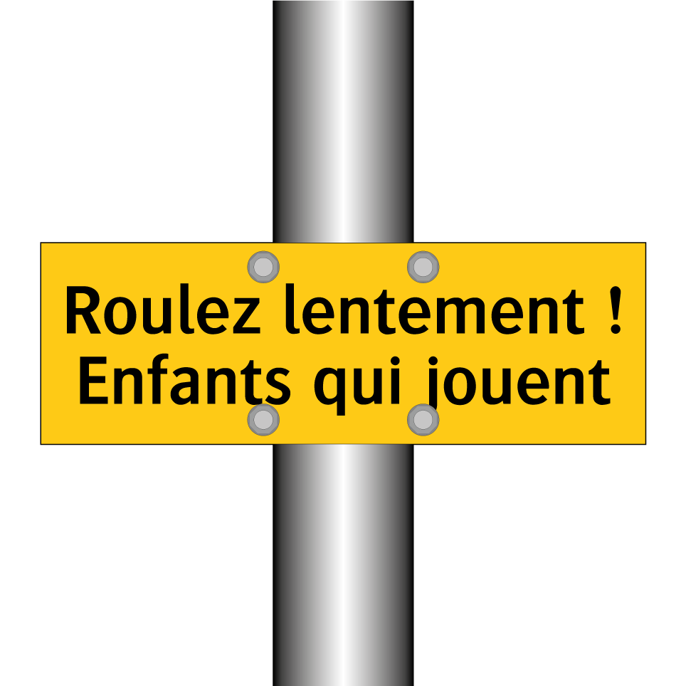 Panneau d'avertissement avec le texte : "Roulez lentement ! Enfants qui jouent"