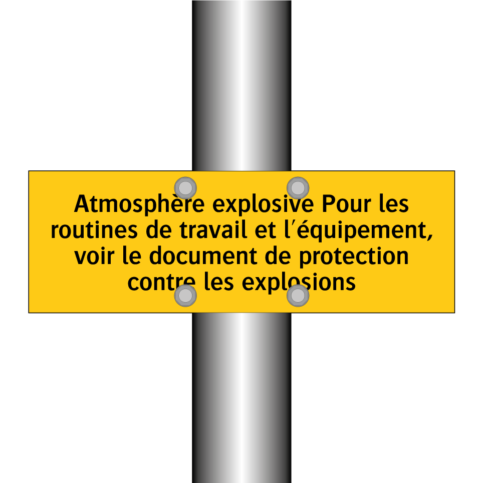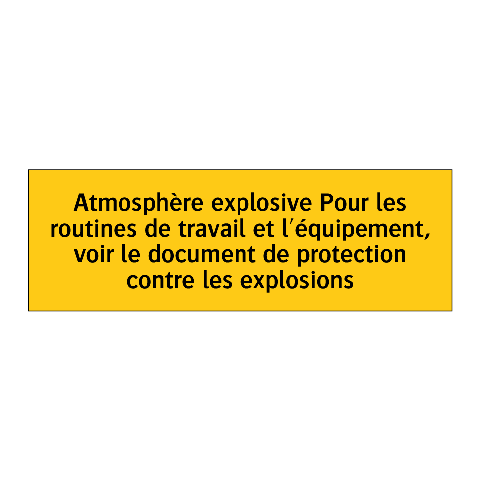 Panneau d'avertissement avec le texte : "Atmosphère explosive Pour les routines de travail et l'équipement, voir le document de protection contre les explosions"