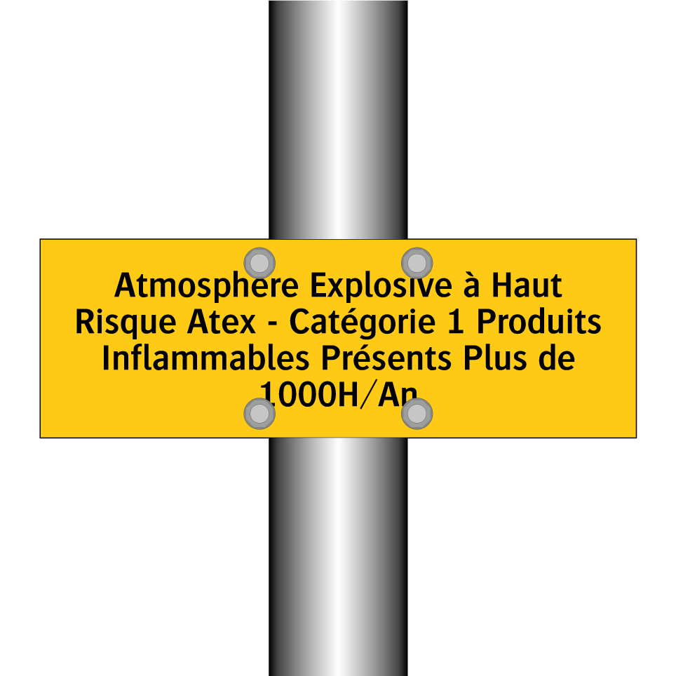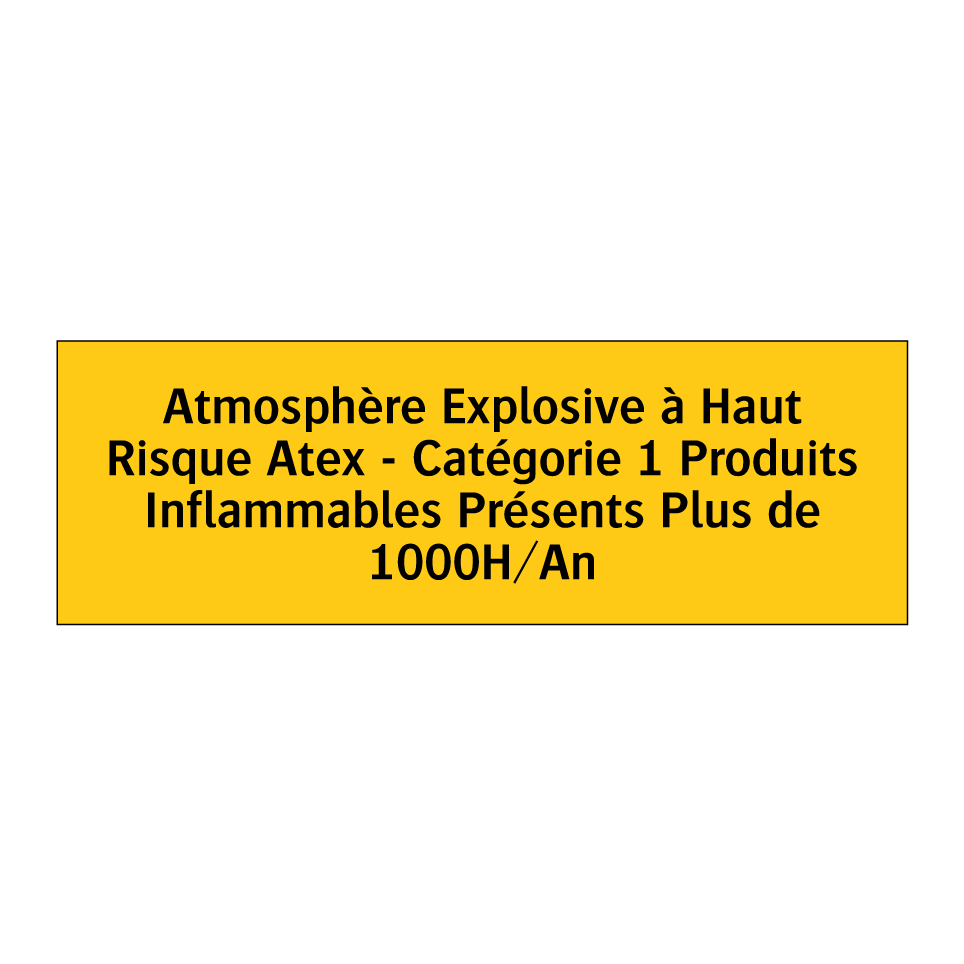 Panneau d'avertissement avec le texte : "Atmosphère Explosive à Haut Risque Atex - Catégorie 1 Produits Inflammables Présents Plus de 1000H/An"
