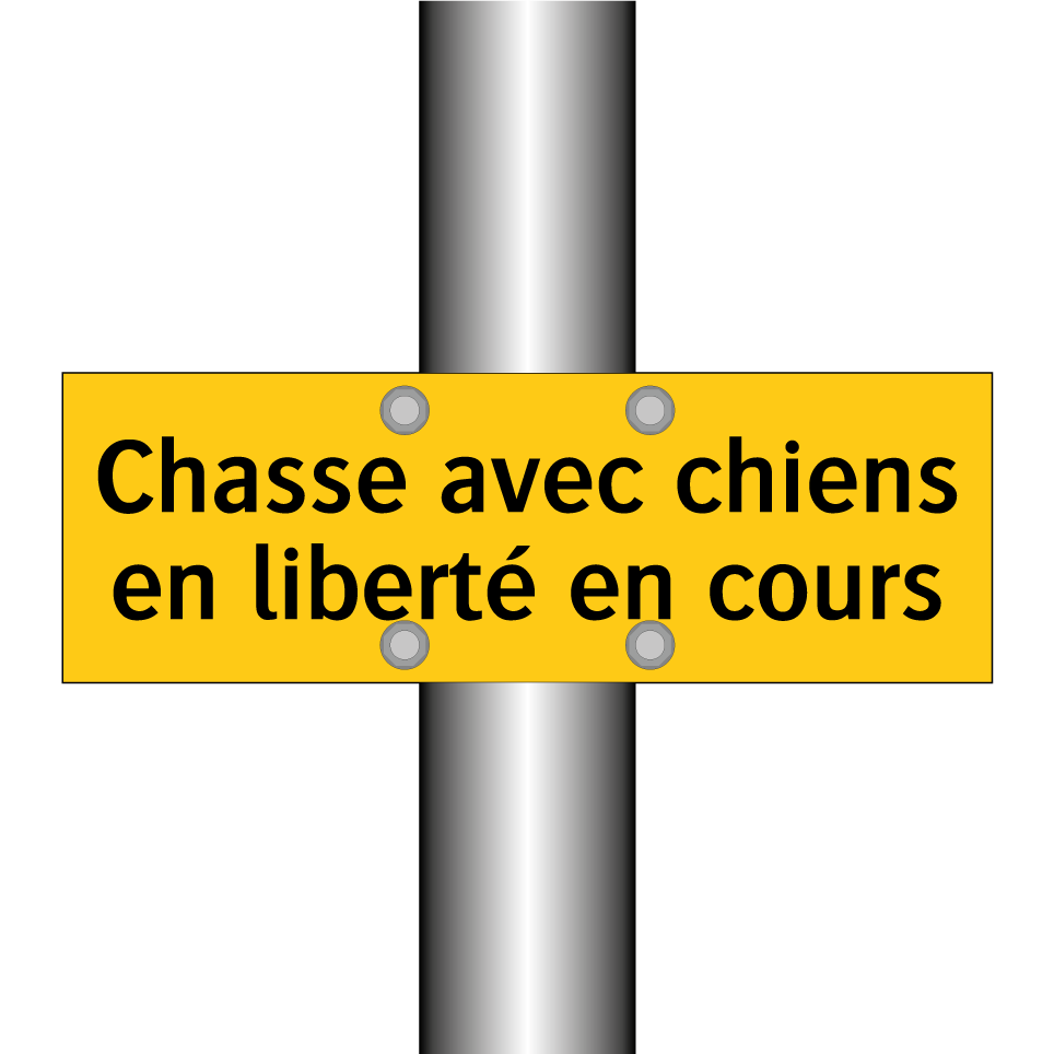 Panneau d'avertissement avec le texte : "Chasse avec chiens en liberté en cours"