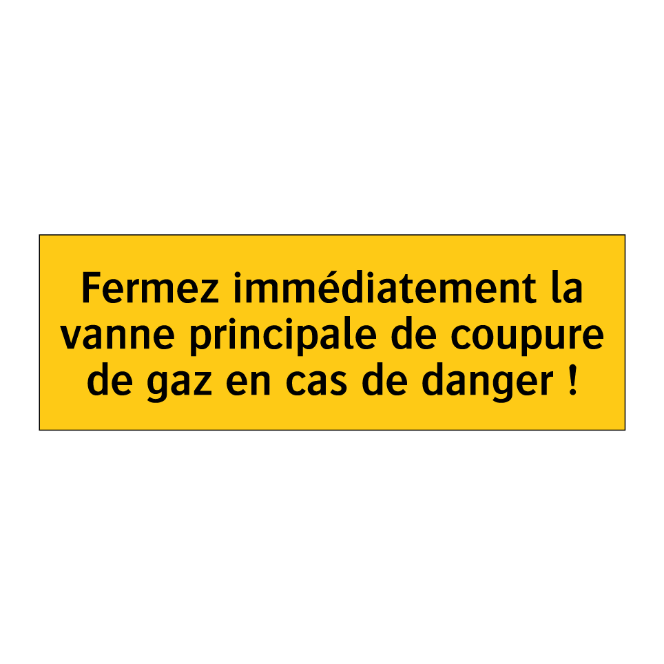 Panneau d'avertissement avec le texte : "Fermez immédiatement la vanne principale de coupure de gaz en cas de danger !"