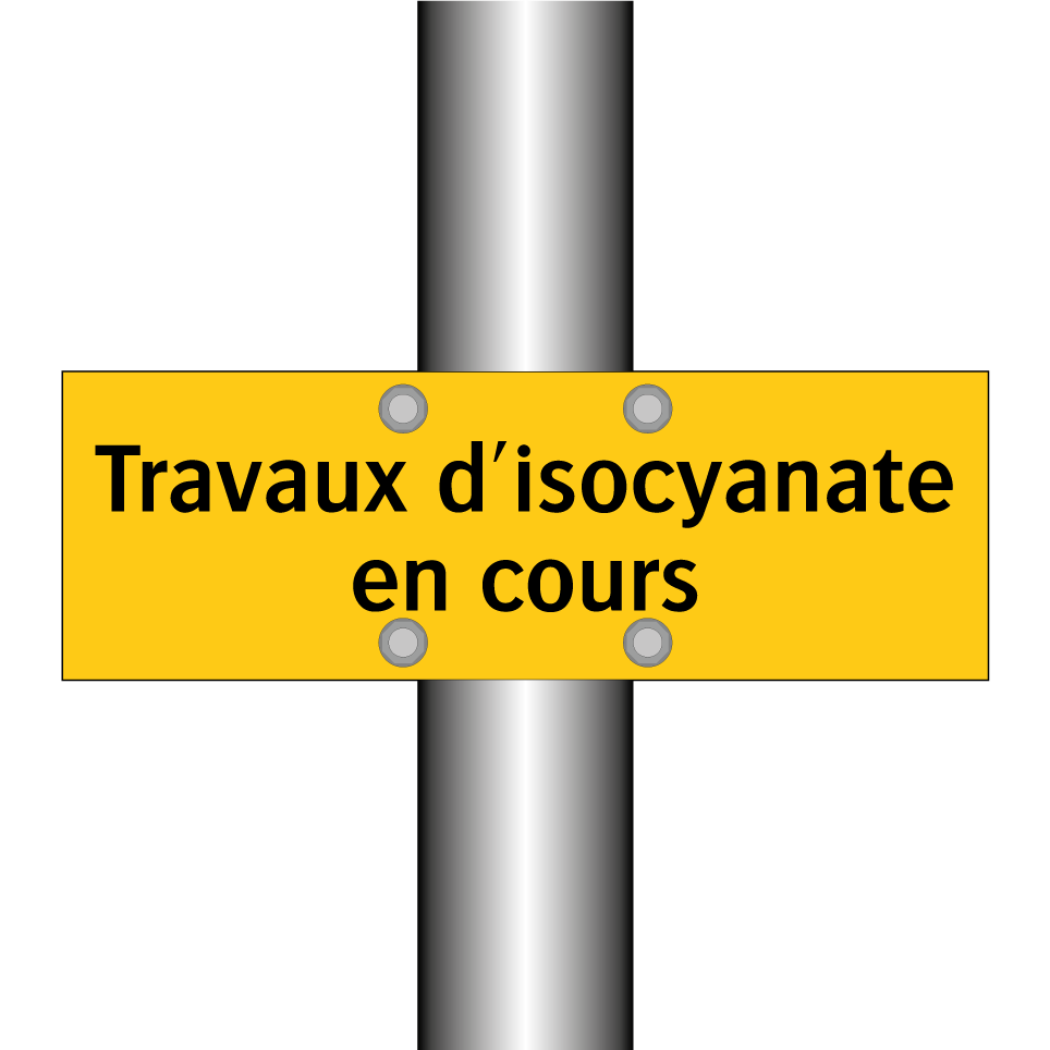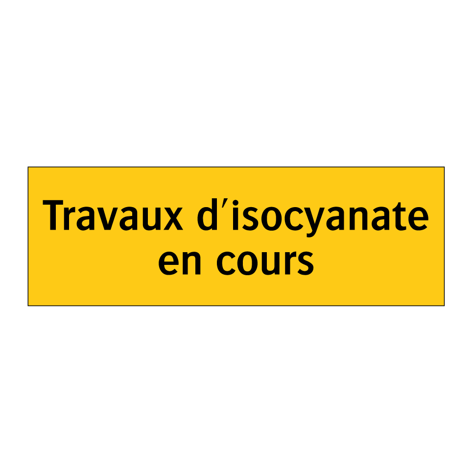 Panneau d'avertissement avec le texte : "Travaux d'isocyanate en cours"