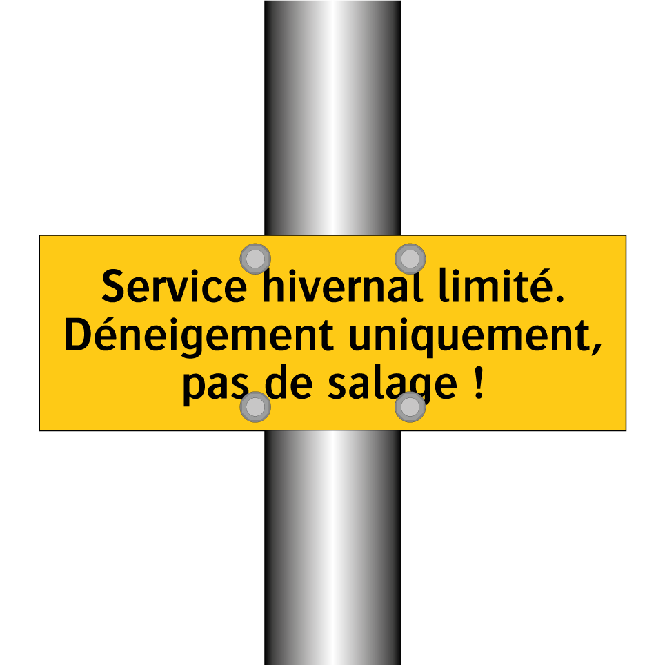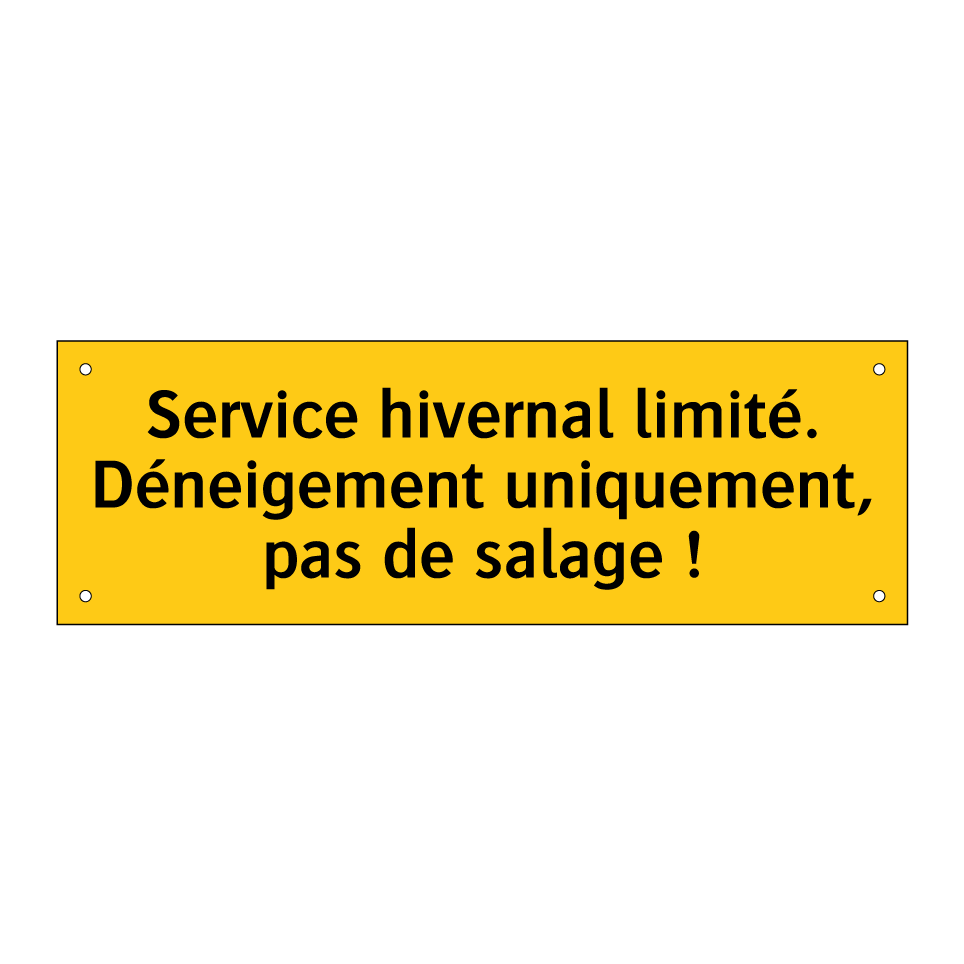 Panneau d'avertissement avec le texte : "Service hivernal limité. Déneigement uniquement, pas de salage !"
