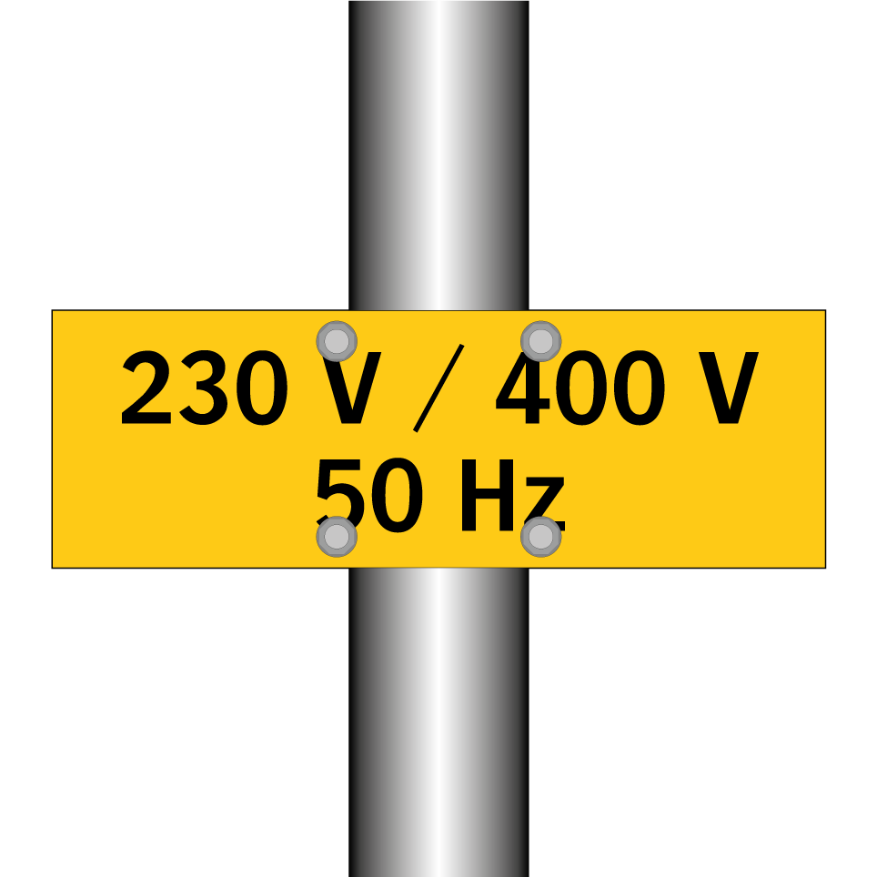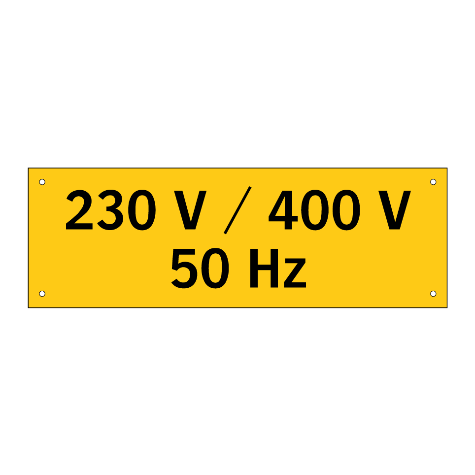 Panneau d'avertissement avec le texte : "230 V / 400 V 50 Hz"