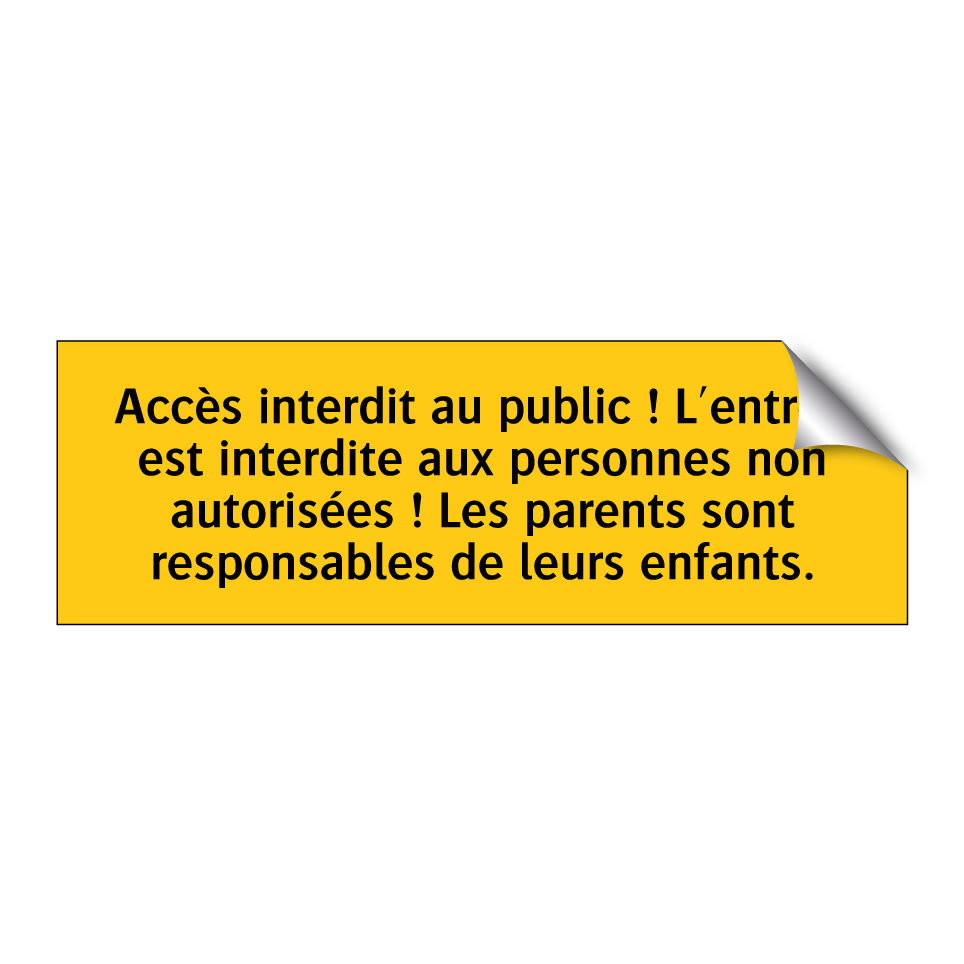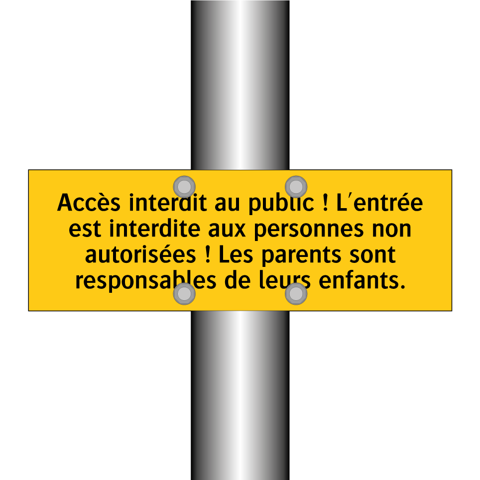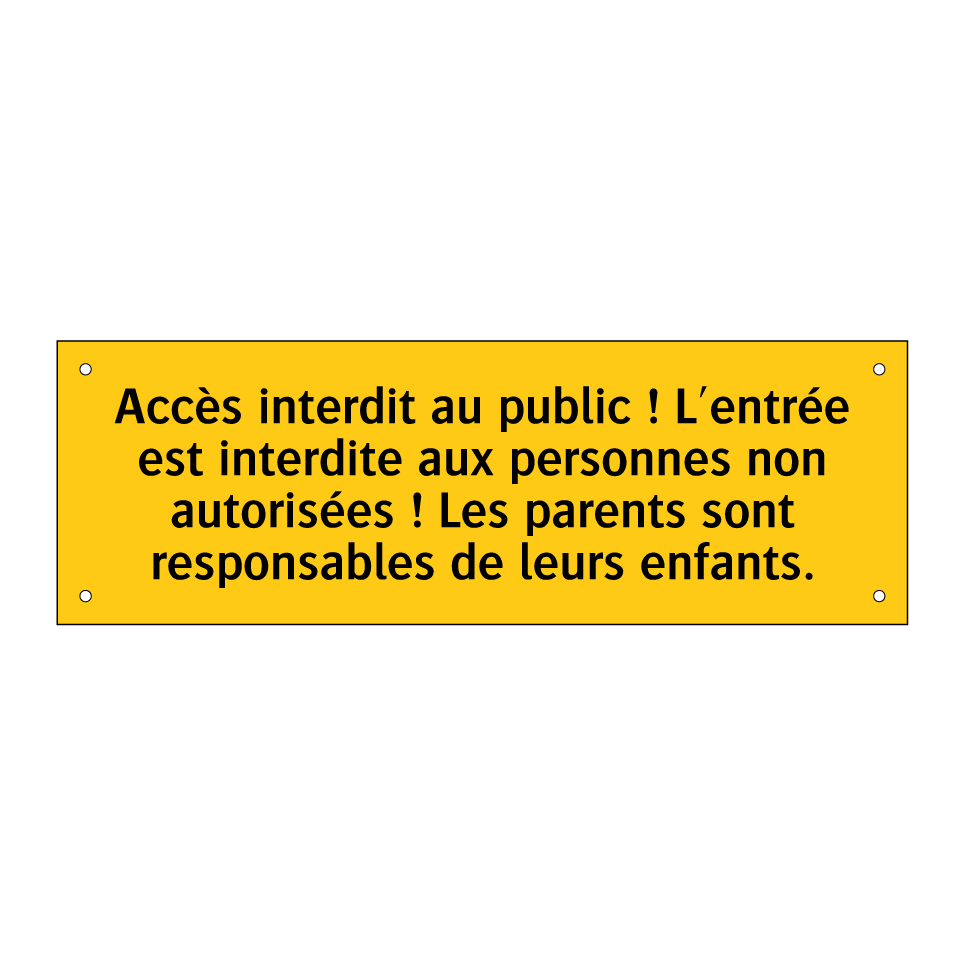 Panneau d'avertissement avec le texte : "Accès interdit au public ! L'entrée est interdite aux personnes non autorisées ! Les parents sont responsables de leurs enfants"