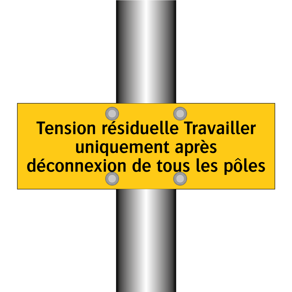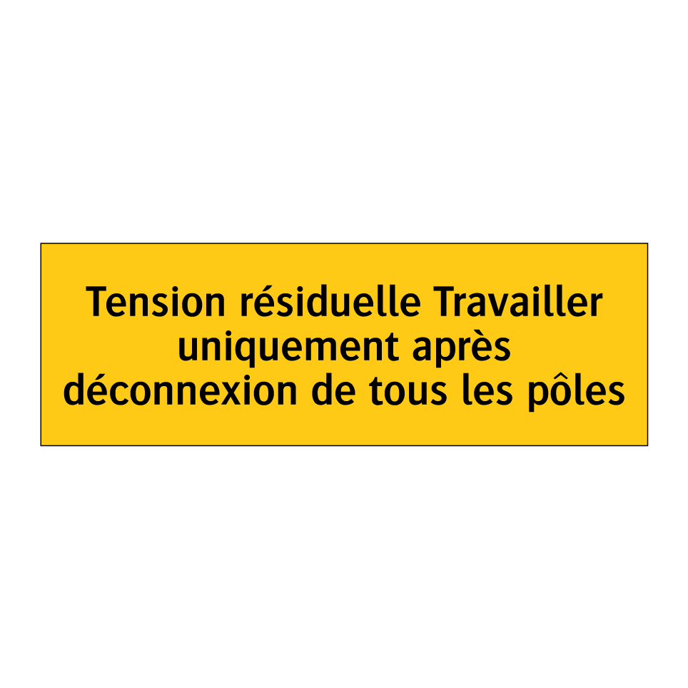 Panneau d'avertissement avec le texte : "Tension résiduelle Travailler uniquement après déconnexion de tous les pôles"