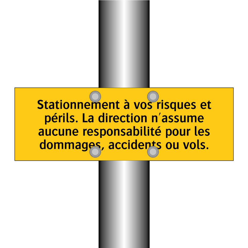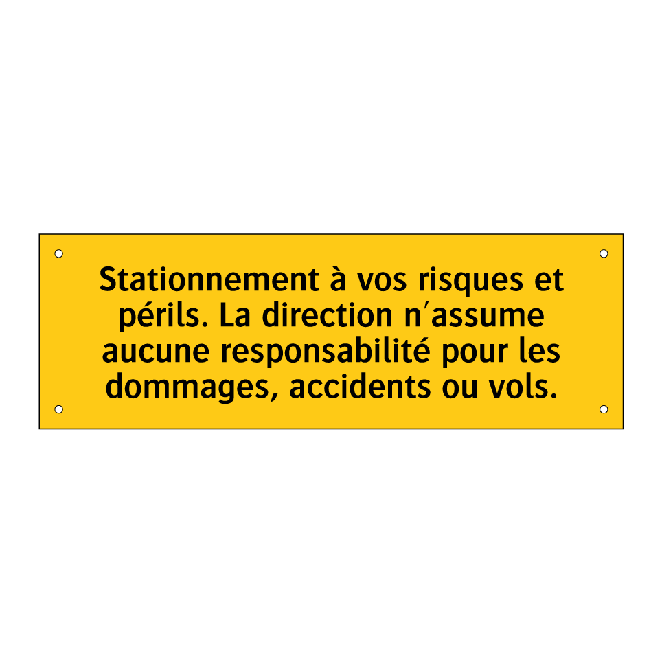 Panneau d'avertissement avec le texte : "Stationnement à vos risques et périls. La direction n'assume aucune responsabilité pour les dommages, accidents ou vols"