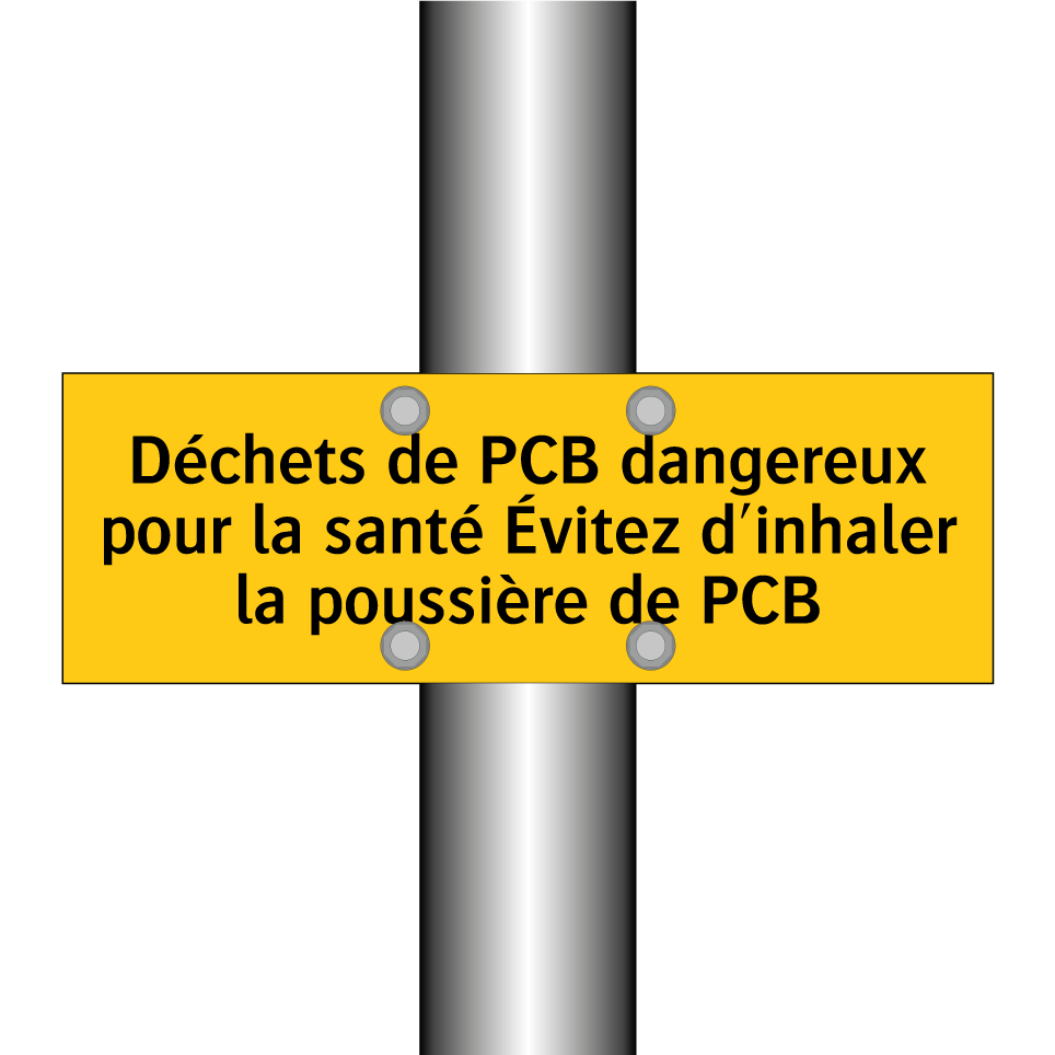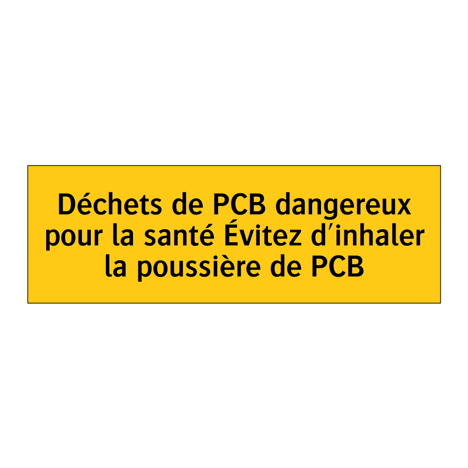 Panneau d'avertissement avec le texte : "Déchets de PCB dangereux pour la santé Évitez d'inhaler la poussière de PCB"