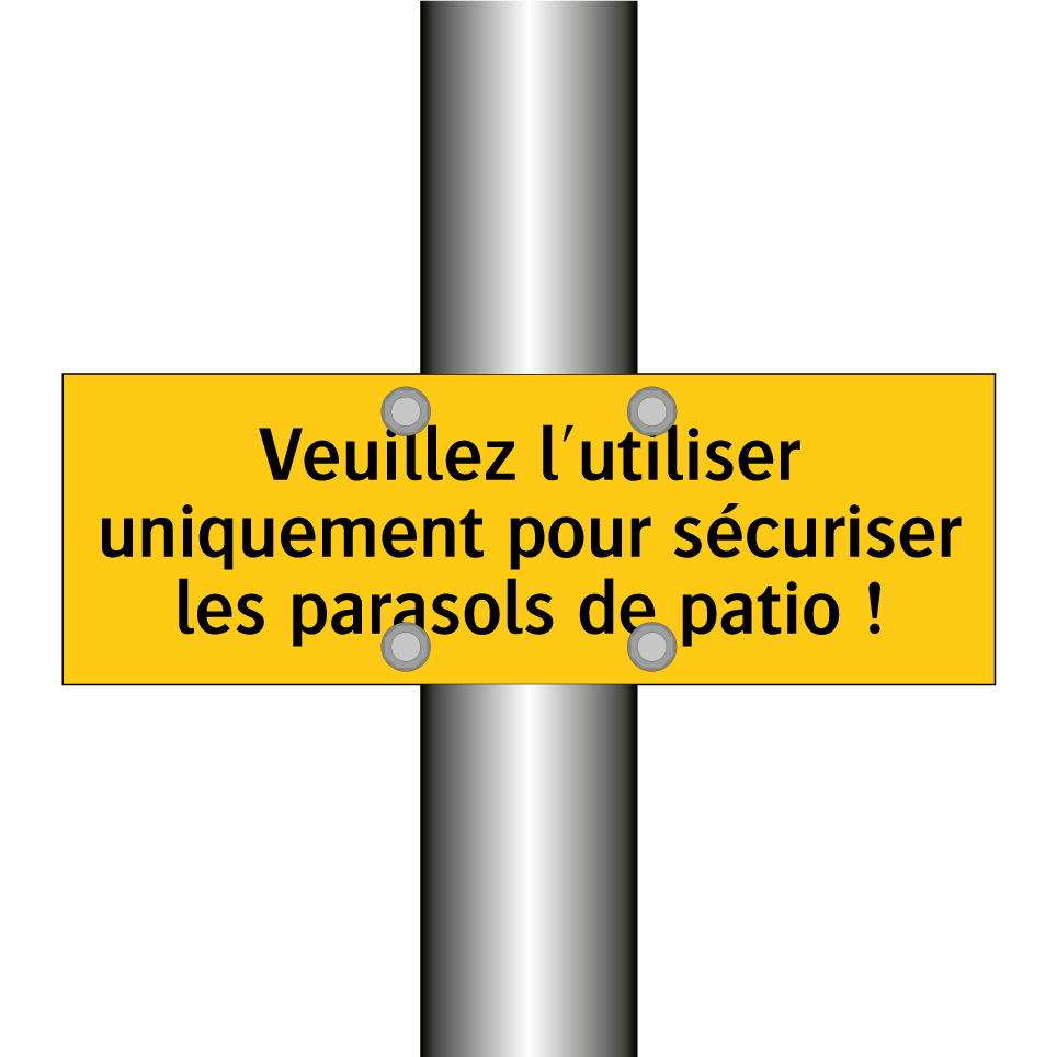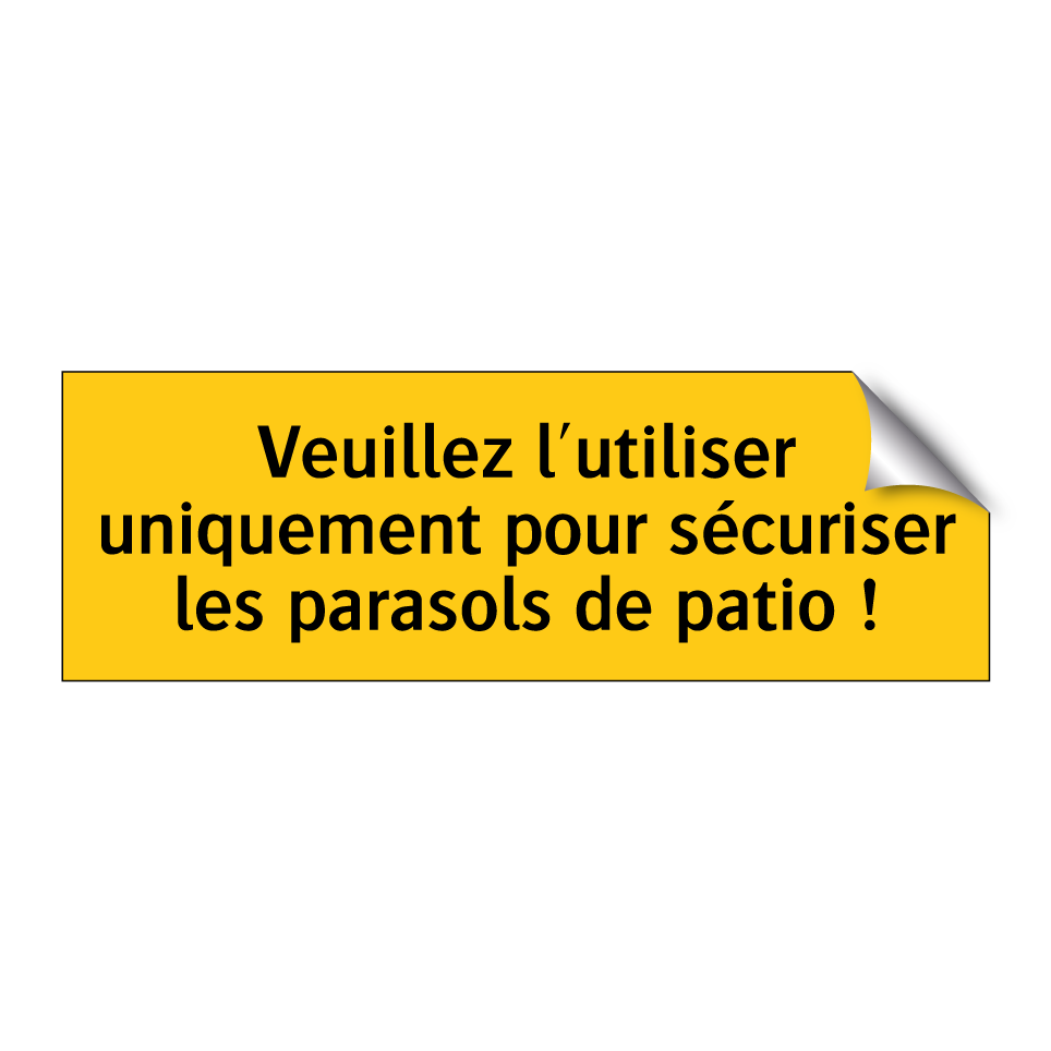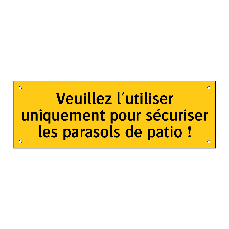 Panneau d'avertissement avec le texte : "Veuillez l'utiliser uniquement pour sécuriser les parasols de patio !"