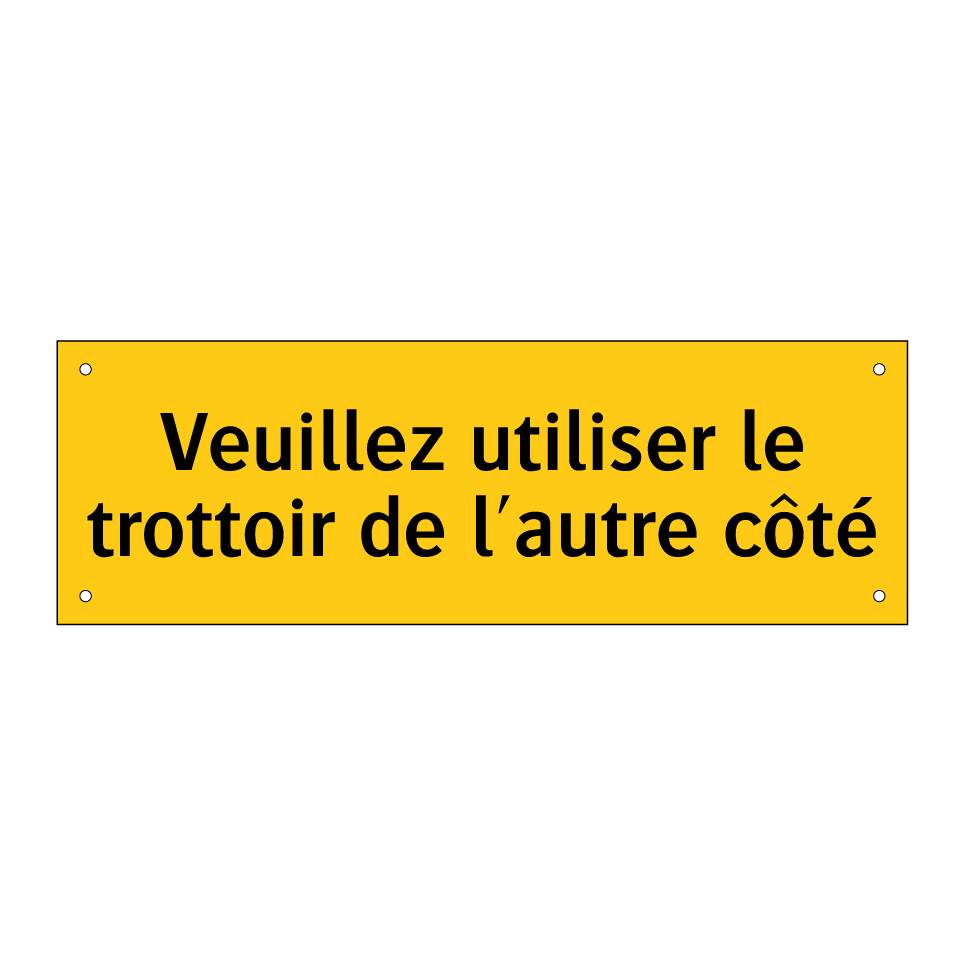 Panneau d'avertissement avec le texte : "Veuillez utiliser le trottoir de l'autre côté"