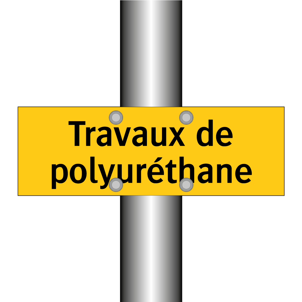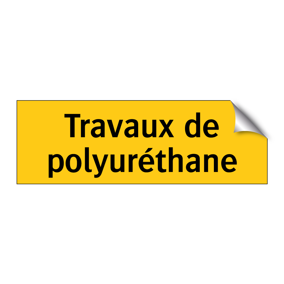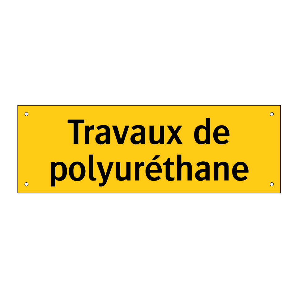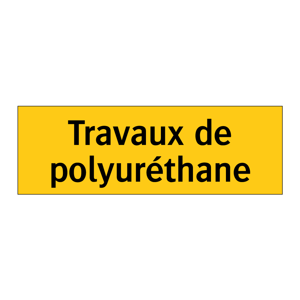 Panneau d'avertissement avec le texte : "Travaux de polyuréthane"