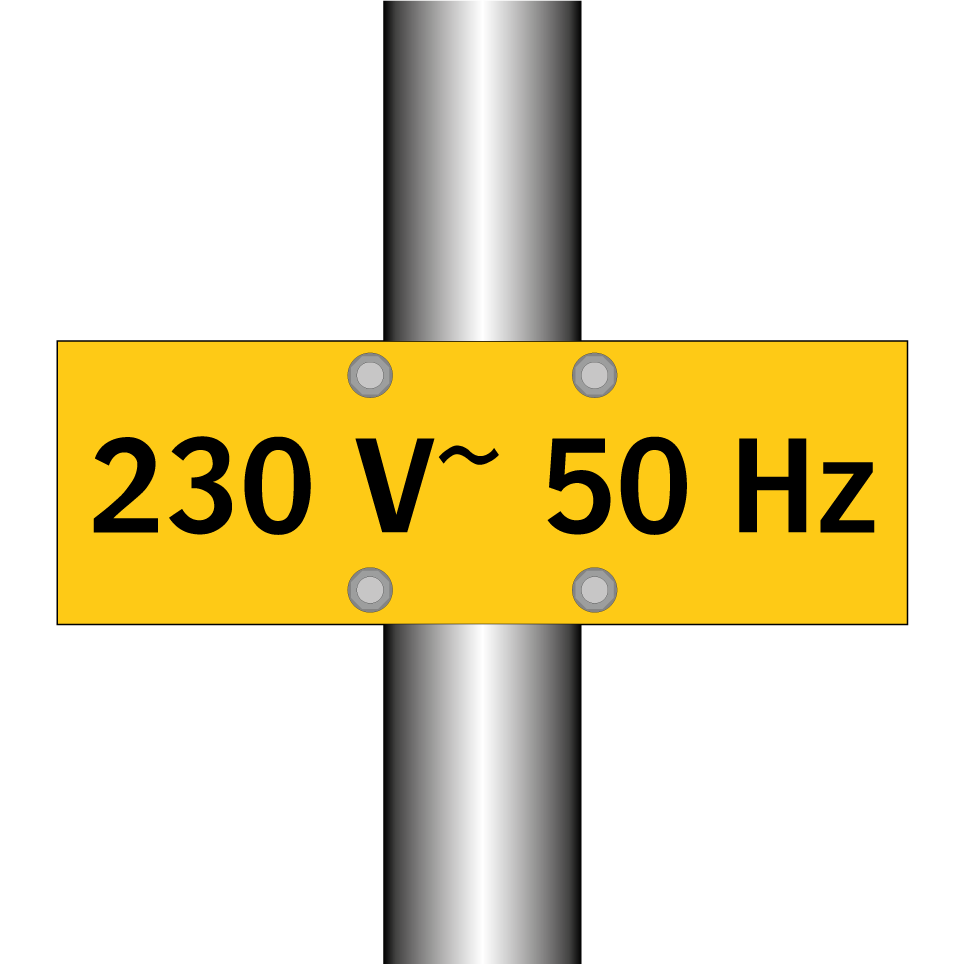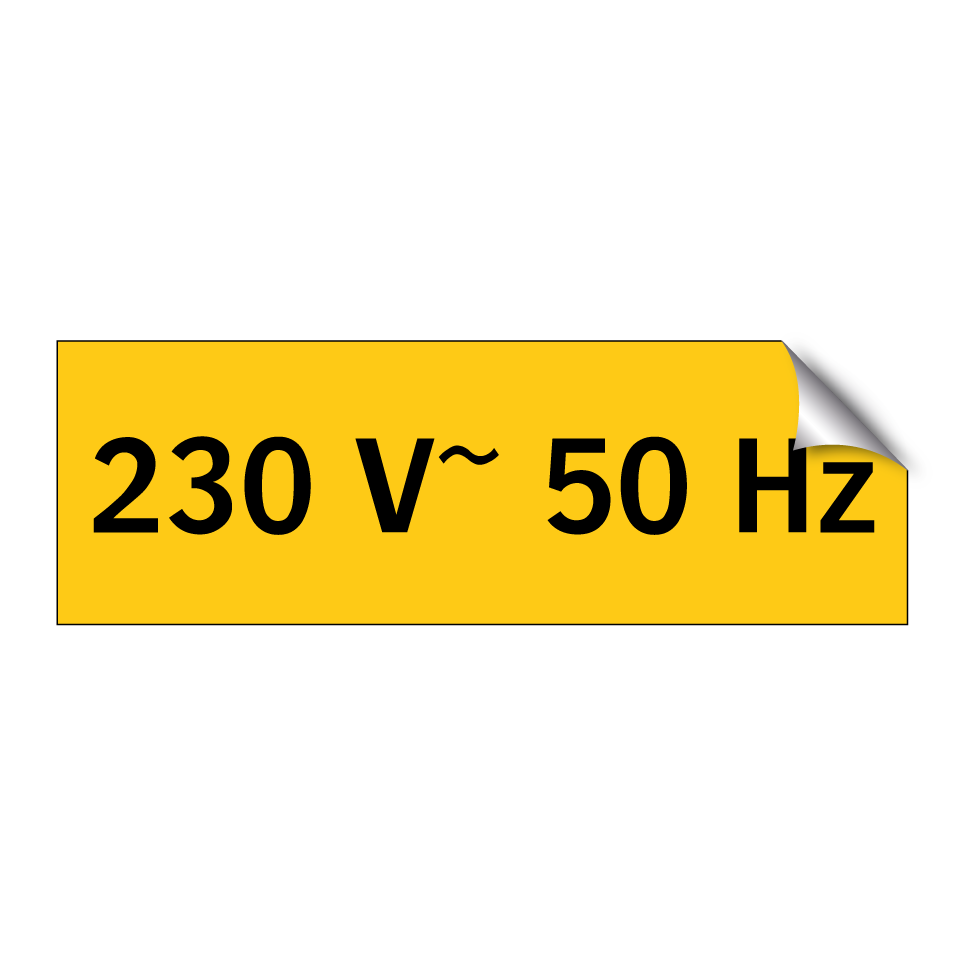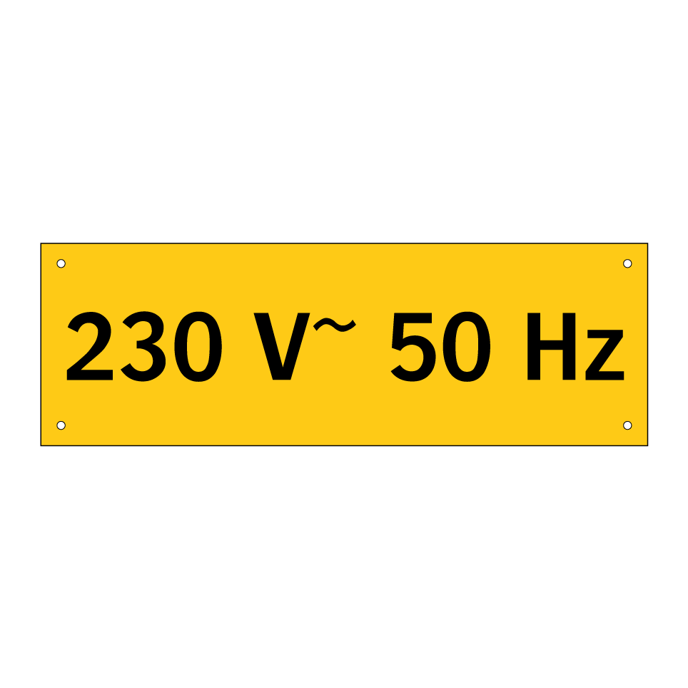 Panneau d'avertissement avec le texte : "230 V~ 50 Hz"