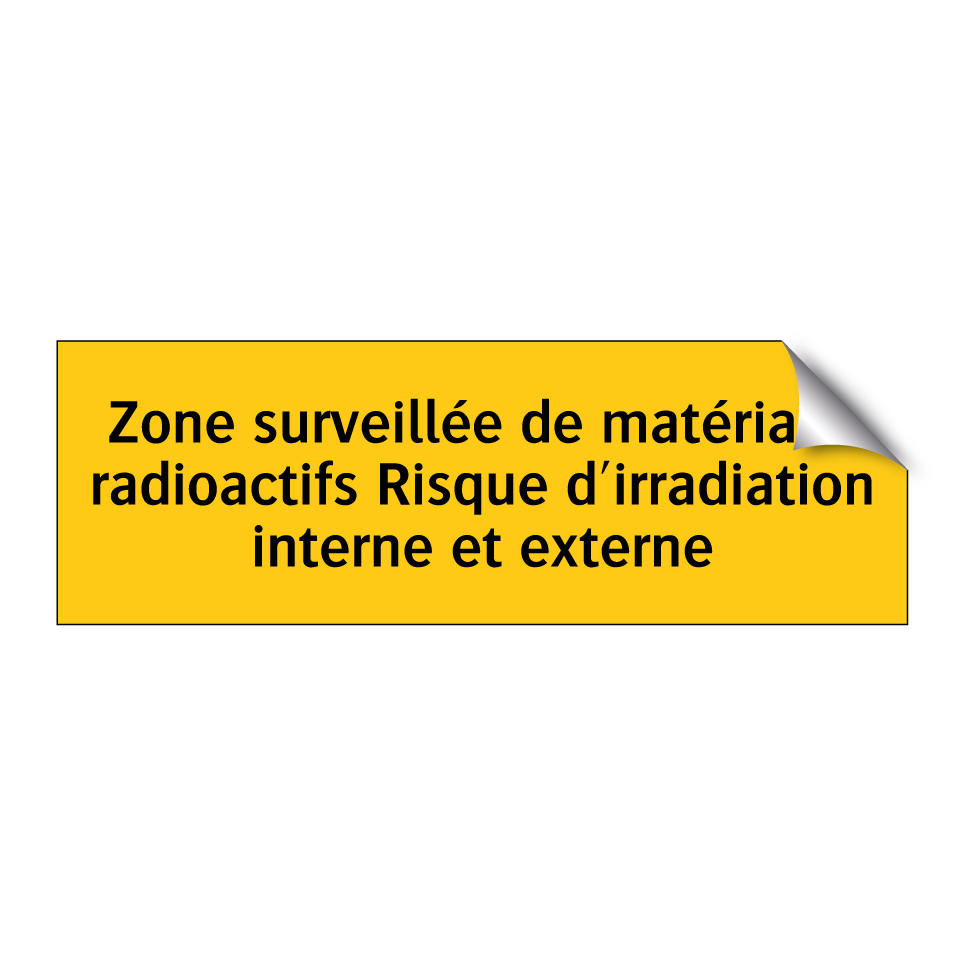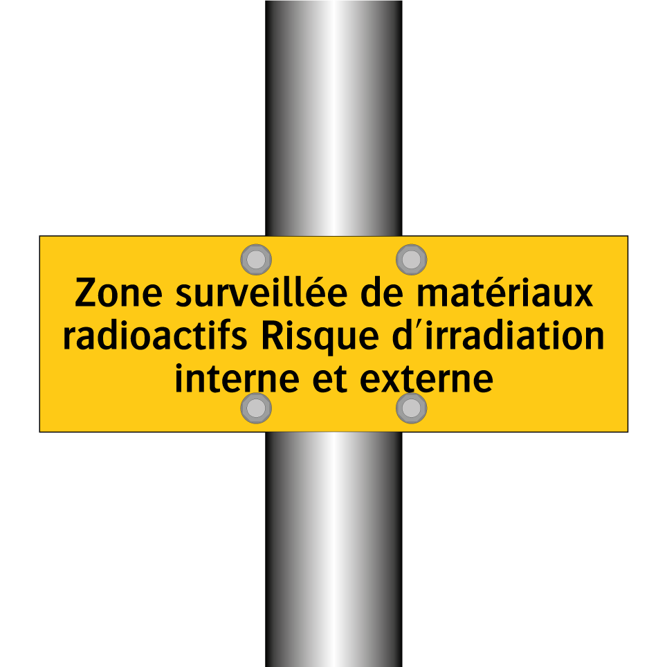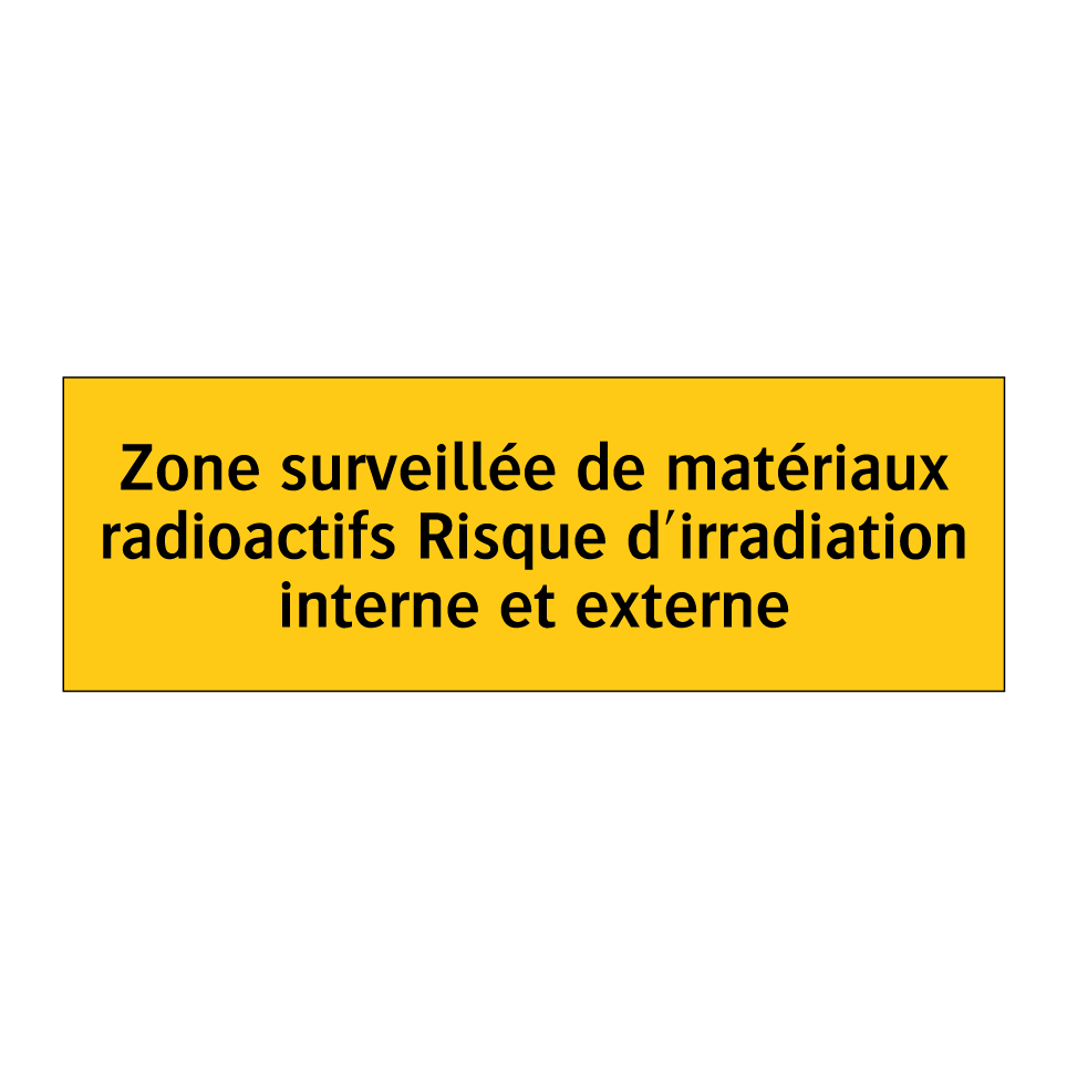 Panneau d'avertissement avec le texte : "Zone surveillée de matériaux radioactifs Risque d'irradiation interne et externe"