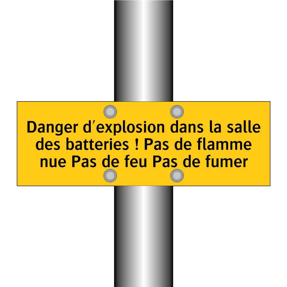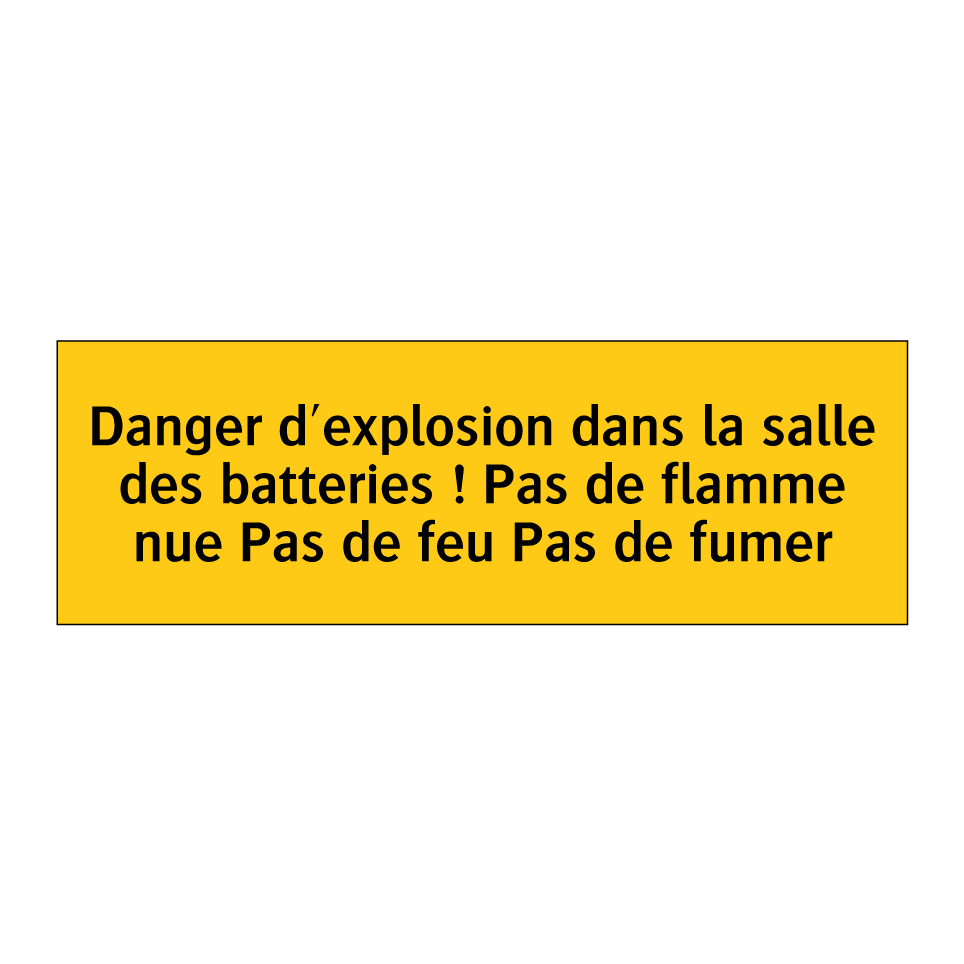 Panneau d'avertissement avec le texte : "Danger d'explosion dans la salle des batteries ! Pas de flamme nue Pas de feu Pas de fumer"
