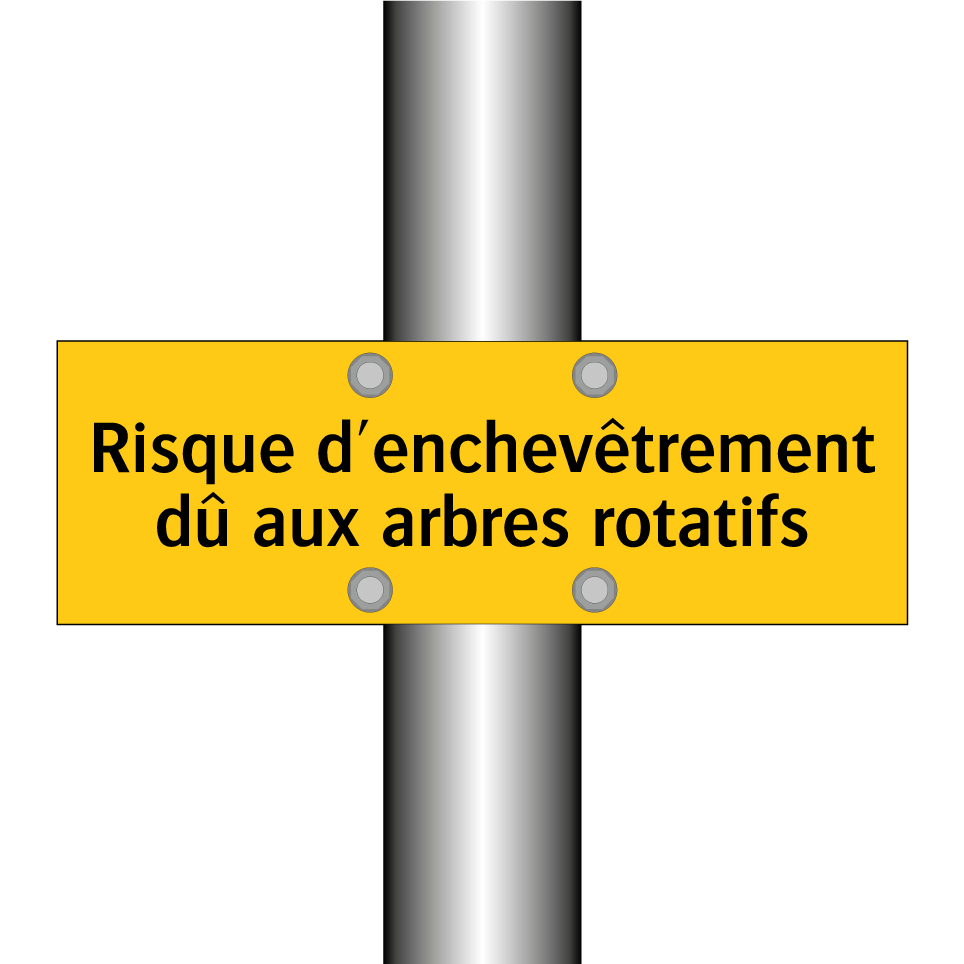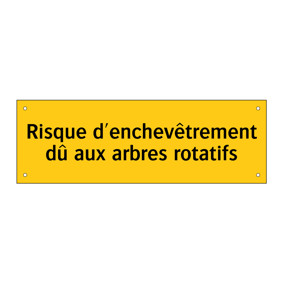 Panneau d'avertissement avec le texte : "Risque d'enchevêtrement dû aux arbres rotatifs"