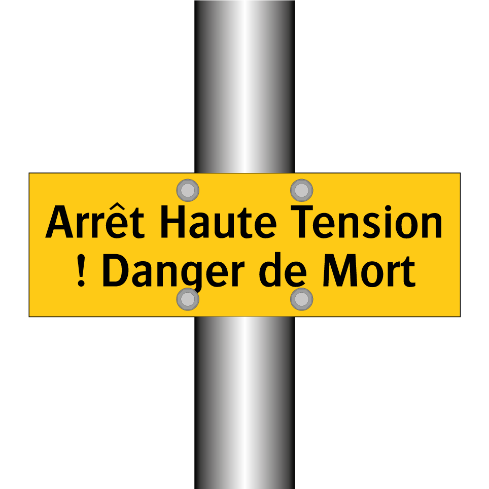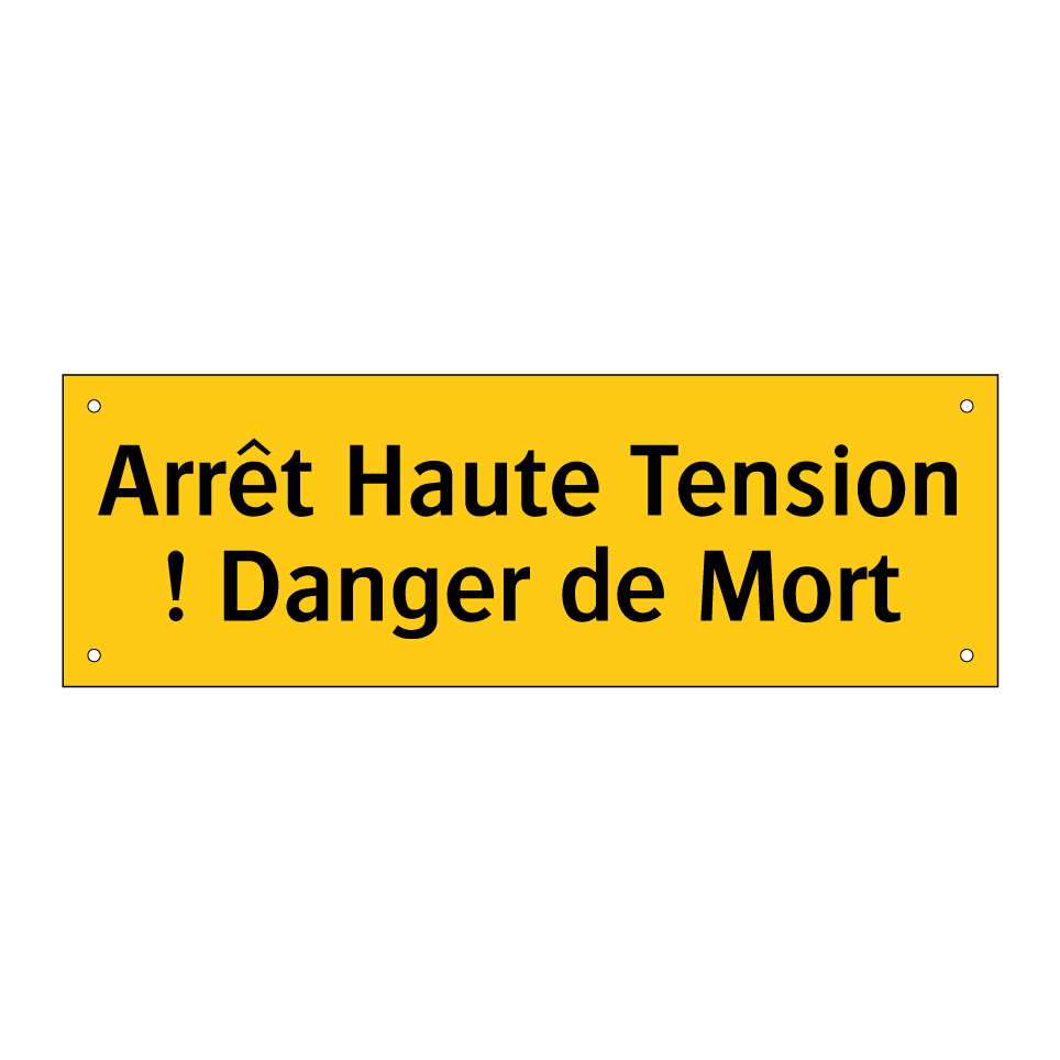 Panneau d'avertissement avec le texte : "Arrêt Haute Tension ! Danger de Mort"
