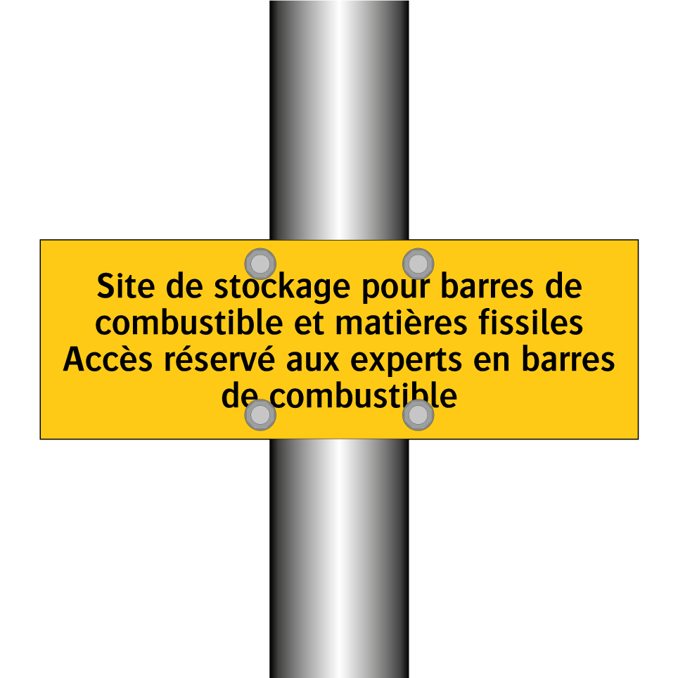 Panneau d'avertissement avec le texte : "Site de stockage pour barres de combustible et matières fissiles Accès réservé aux experts en barres de combustible"