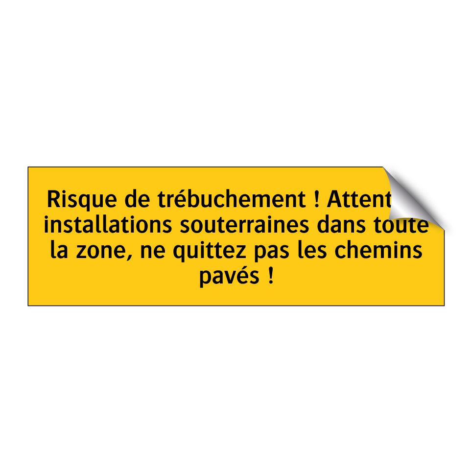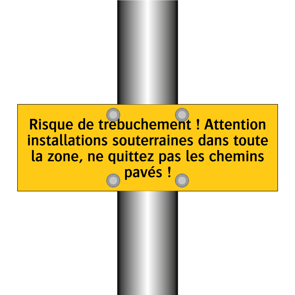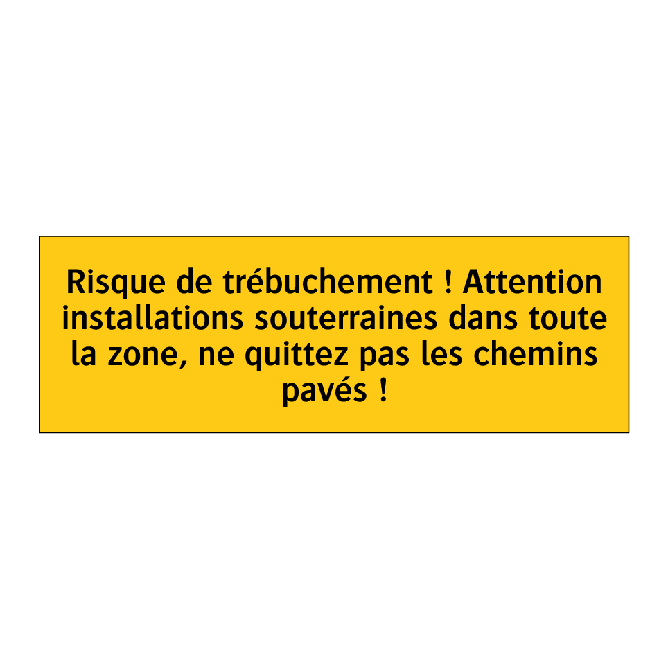 Panneau d'avertissement avec le texte : "Risque de trébuchement ! Attention installations souterraines dans toute la zone, ne quittez pas les chemins pavés !"