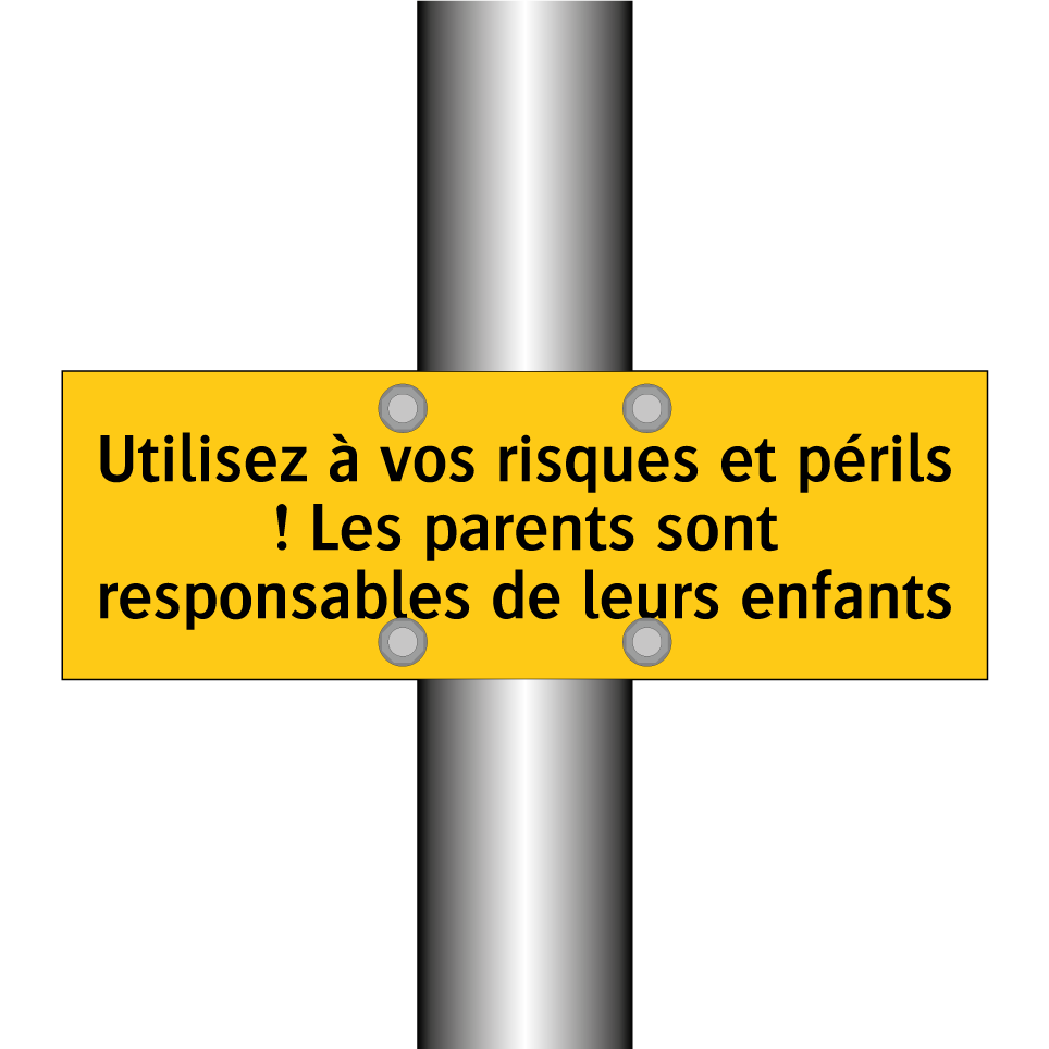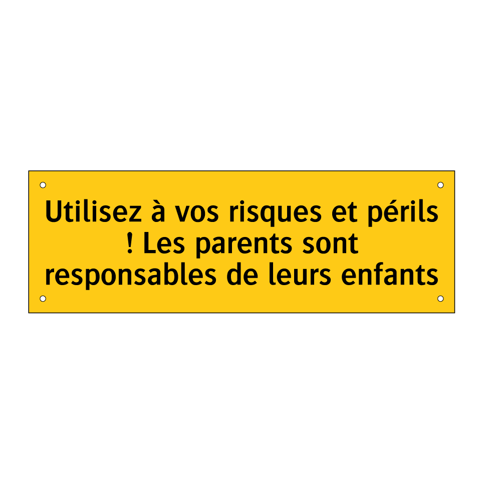 Panneau d'avertissement avec le texte : "Utilisez à vos risques et périls ! Les parents sont responsables de leurs enfants"