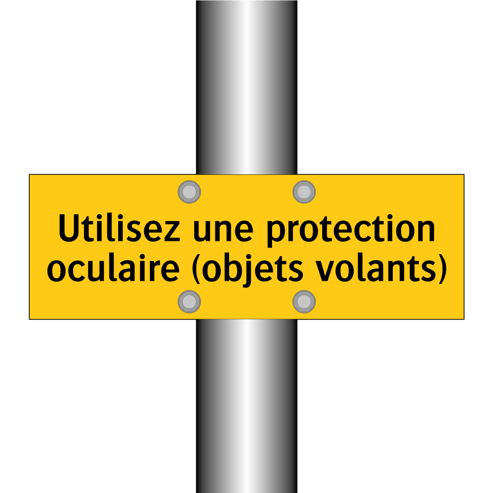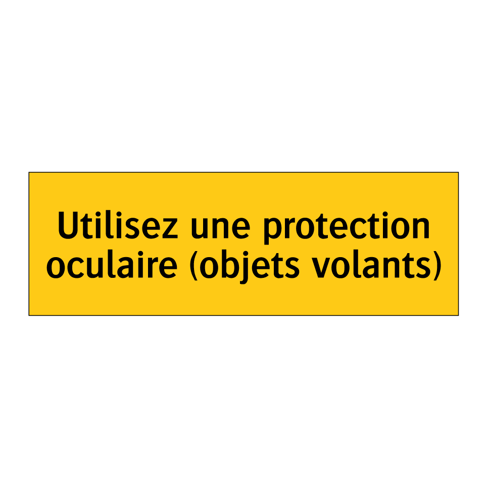 Panneau d'avertissement avec le texte : "Utilisez une protection oculaire (objets volants)"