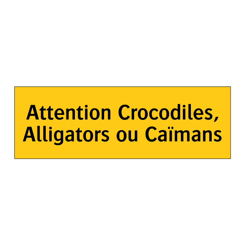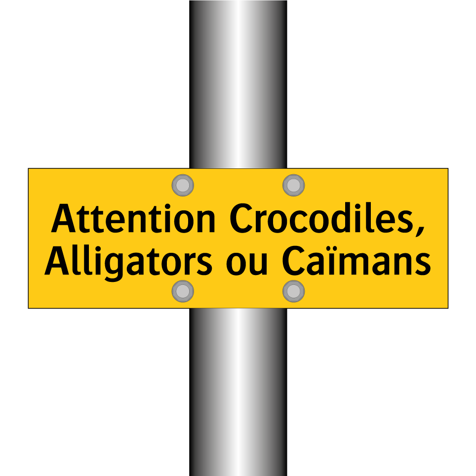 Panneau d'avertissement avec le texte : "Attention Crocodiles, Alligators ou Caïmans"