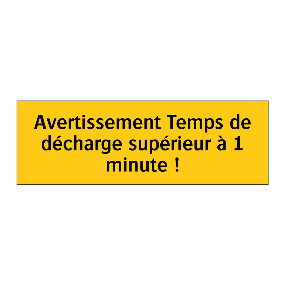 Panneau d'avertissement avec le texte : "Avertissement Temps de décharge supérieur à 1 minute !"