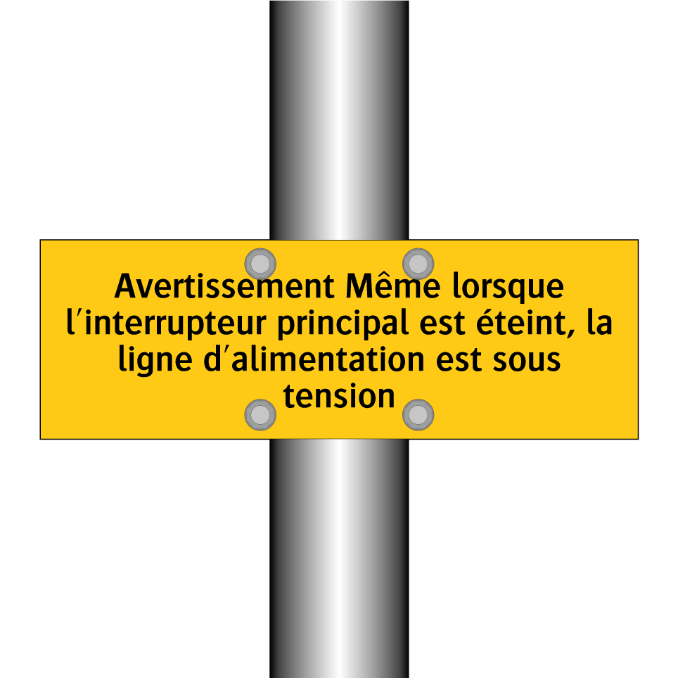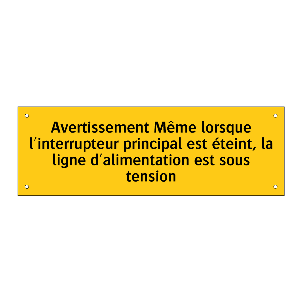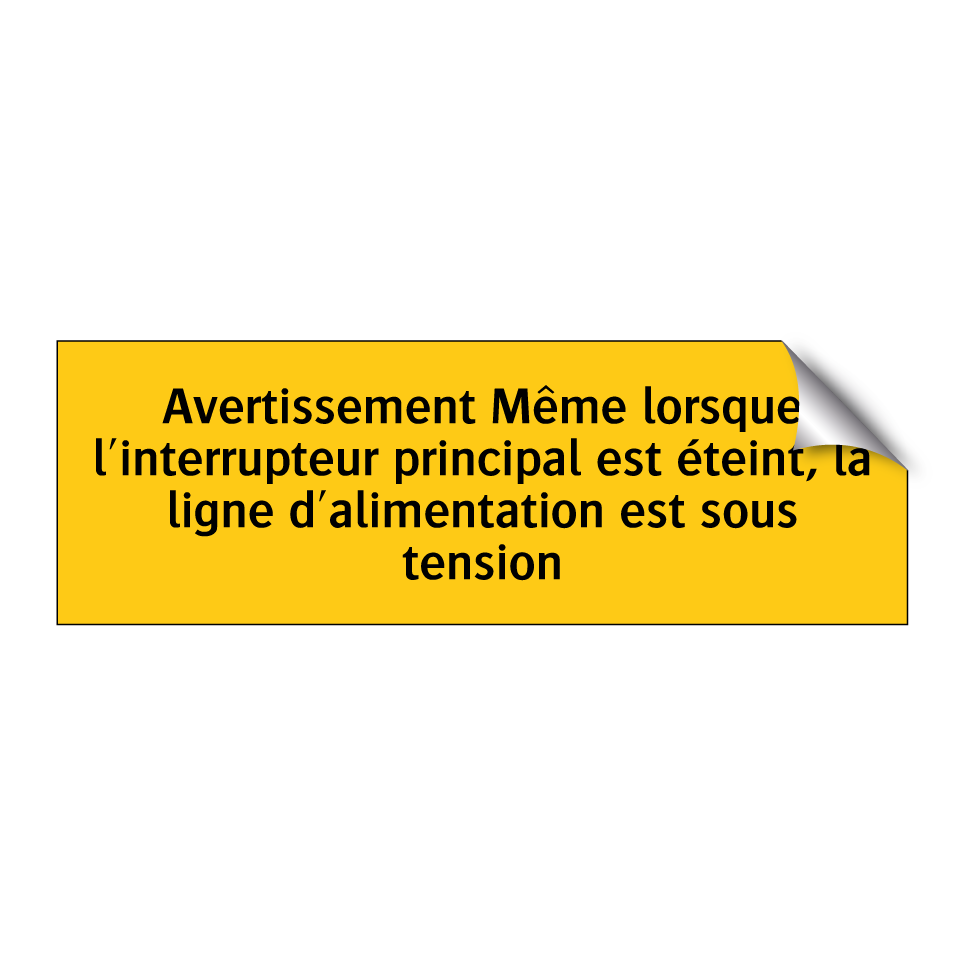 Panneau d'avertissement avec le texte : "Avertissement Même lorsque l'interrupteur principal est éteint, la ligne d'alimentation est sous tension"