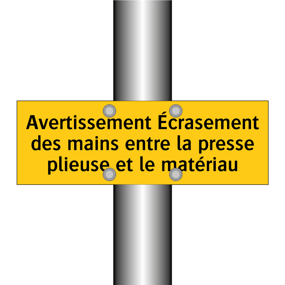 Panneau d'avertissement avec le texte : "Avertissement Écrasement des mains entre la presse plieuse et le matériau"