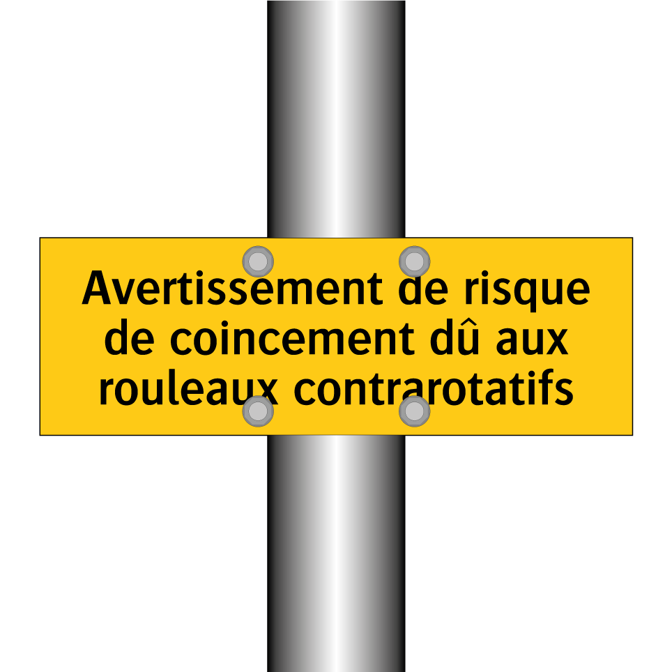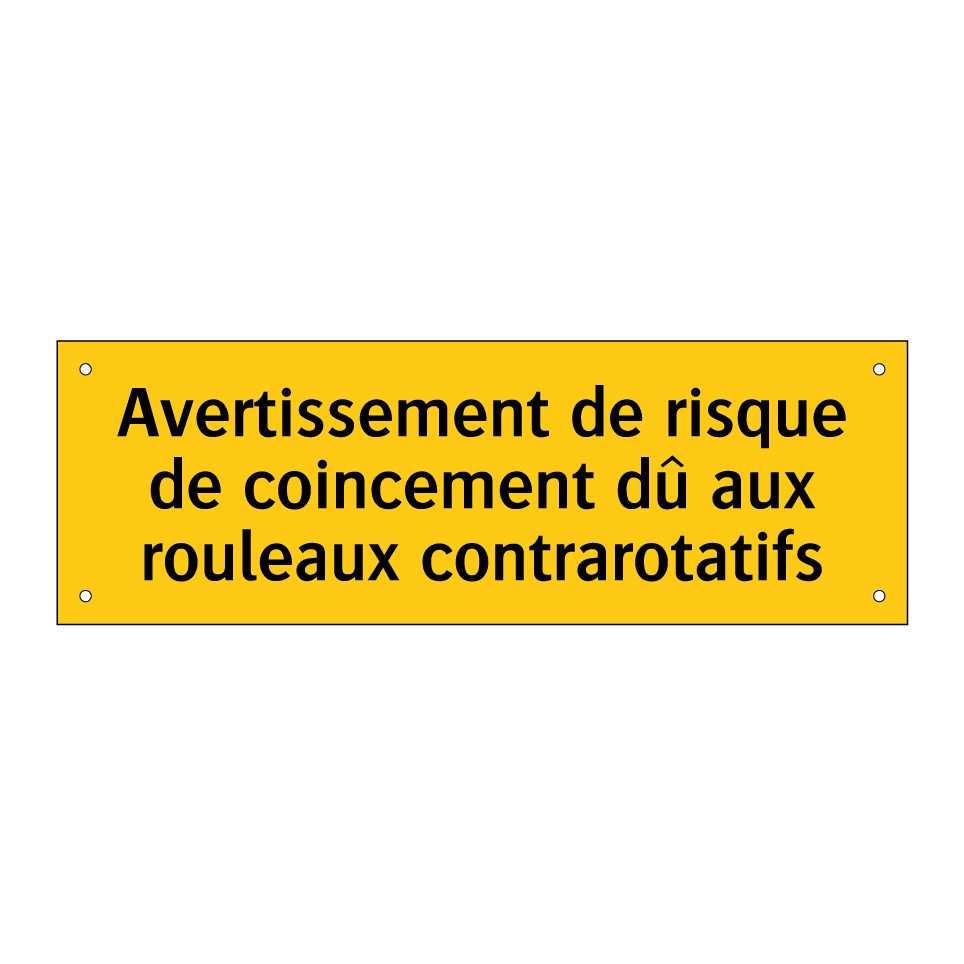 Panneau d'avertissement avec le texte : "Avertissement de risque de coincement dû aux rouleaux contrarotatifs"