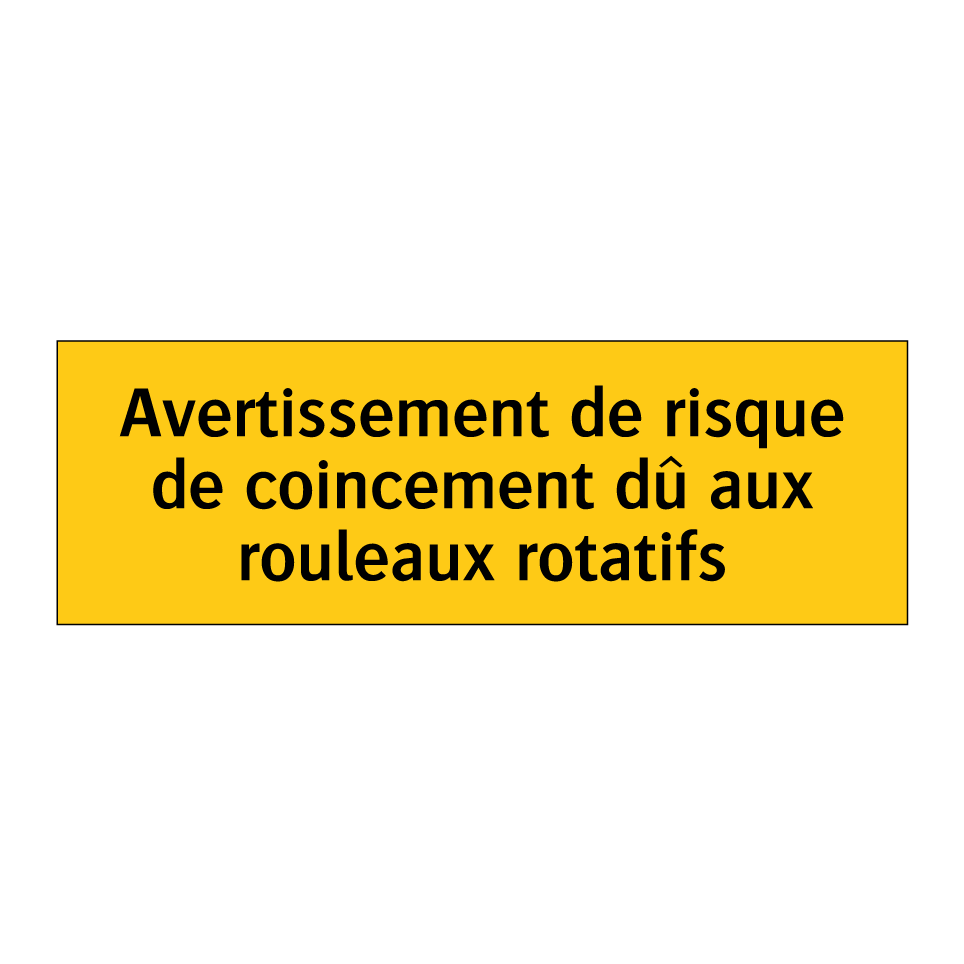 Panneau d'avertissement avec le texte : "Avertissement de risque de coincement dû aux rouleaux rotatifs"
