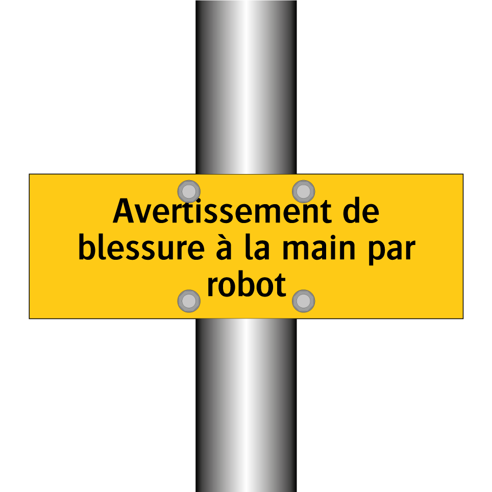Ce panneau d'avertissement est essentiel pour garantir la sécurité dans les environnements où des robots sont en fonctionnement. Conçu pour prévenir les accidents, il attire l'attention sur le risque potentiel de blessure à la main causée par des machines automatisées. Idéal pour les usines, les ateliers de fabrication ou tout autre lieu où des robots industriels sont utilisés, ce panneau peut être placé à proximité des zones de travail robotisées ou des entrées de zones restreintes. En signalant clairement le danger, il contribue à sensibiliser le personnel et à réduire les risques d'accidents. Sa couleur jaune vive et son texte noir assurent une visibilité optimale, même à distance.