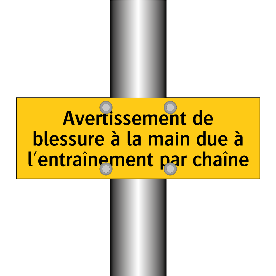 Panneau d'avertissement avec le texte : "Avertissement de blessure à la main due à l'entraînement par chaîne"