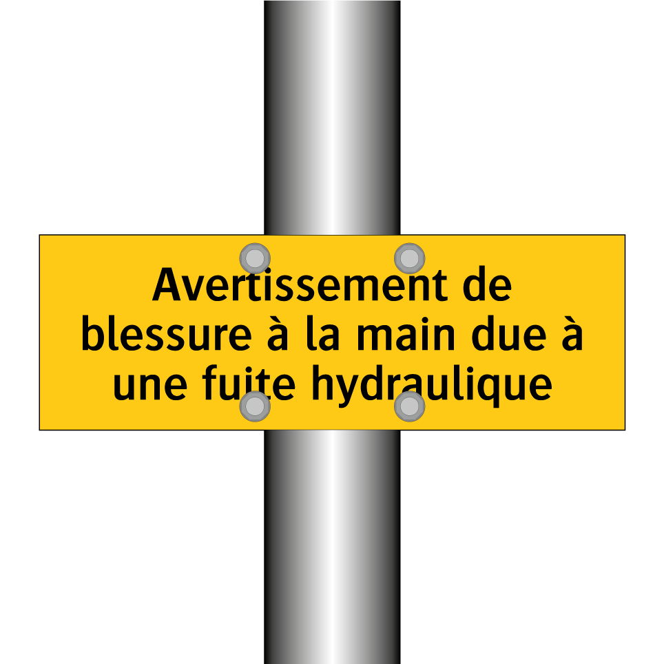 Panneau d'avertissement avec le texte : "Avertissement de blessure à la main due à une fuite hydraulique"