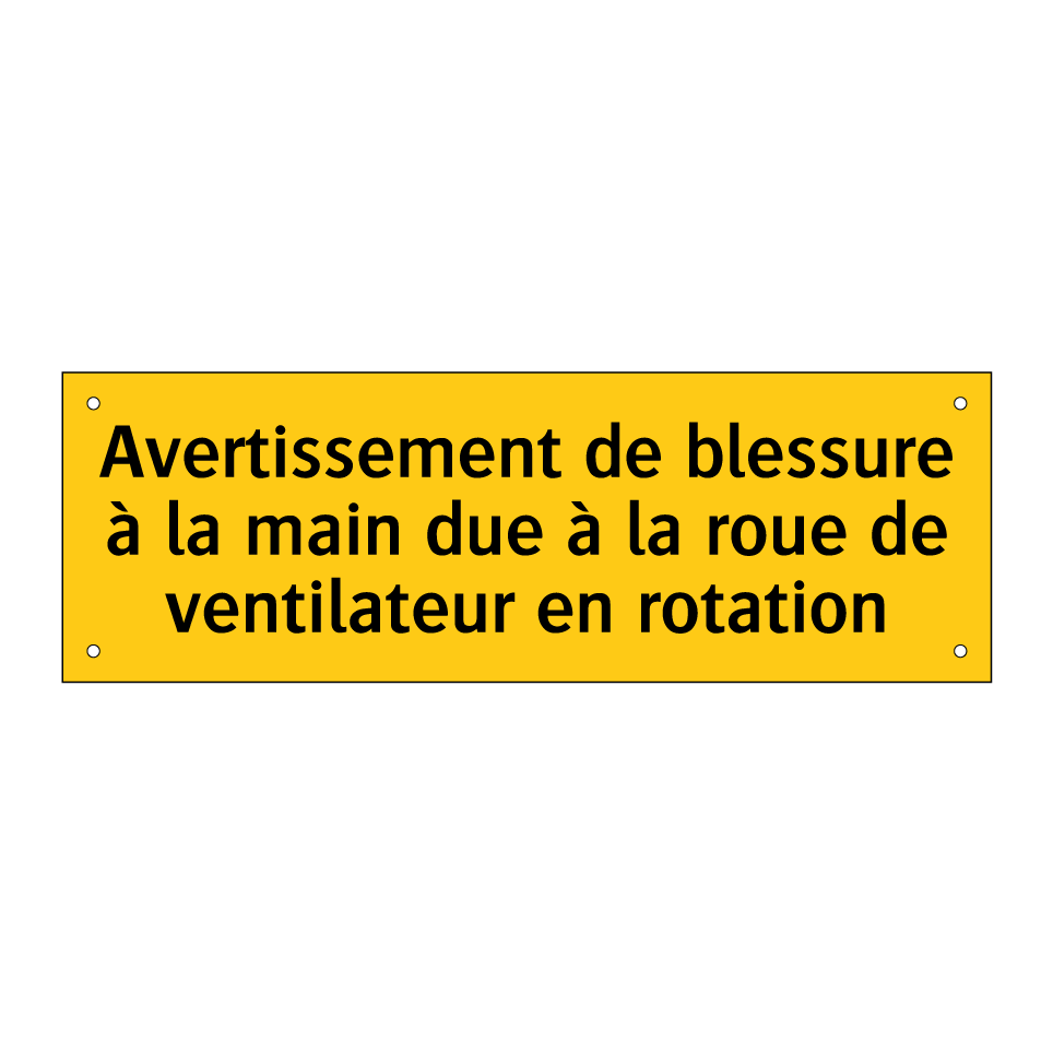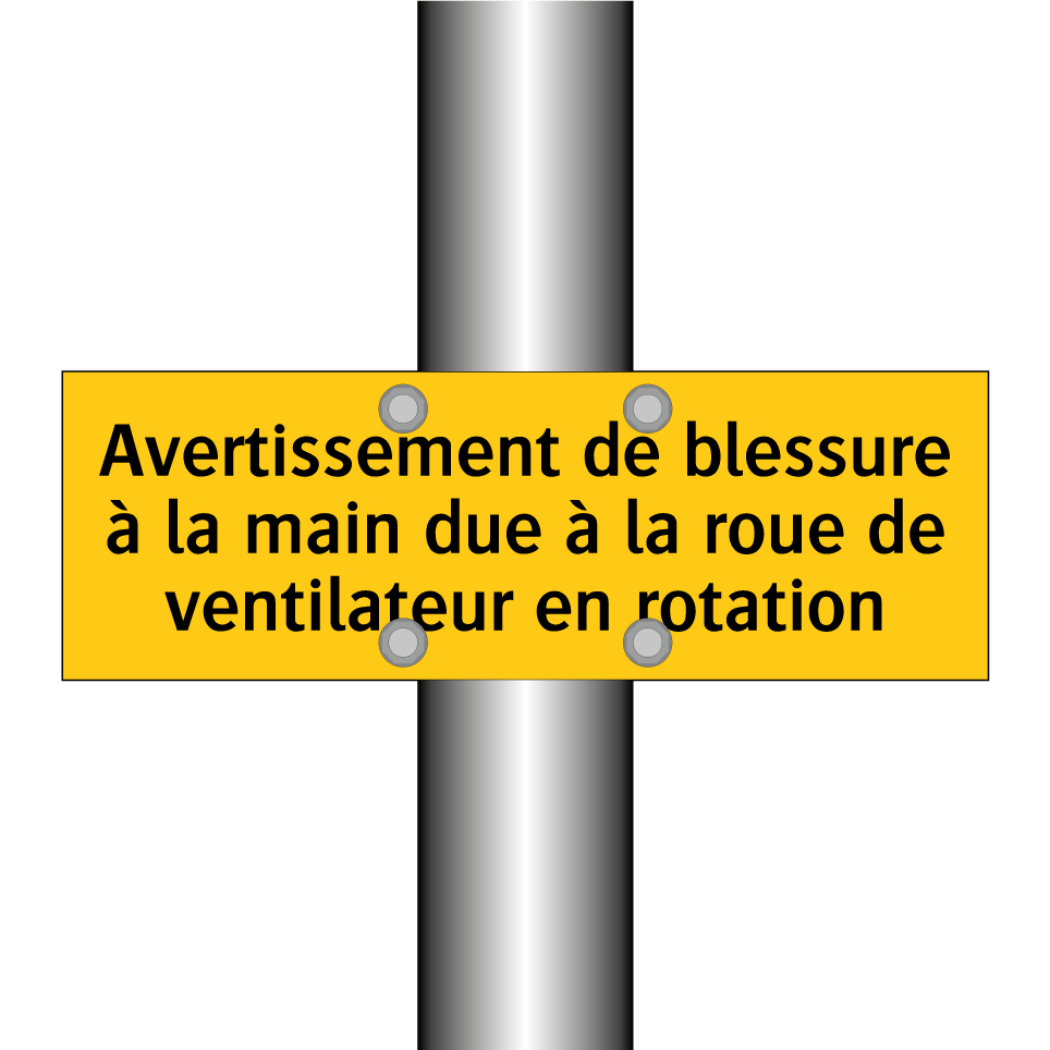 Panneau d'avertissement avec le texte : "Avertissement de blessure à la main due à la roue de ventilateur en rotation"
