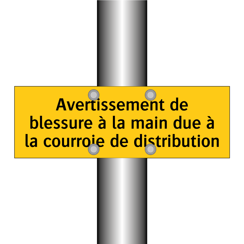 Panneau d'avertissement avec le texte : "Avertissement de blessure à la main due à la courroie de distribution"