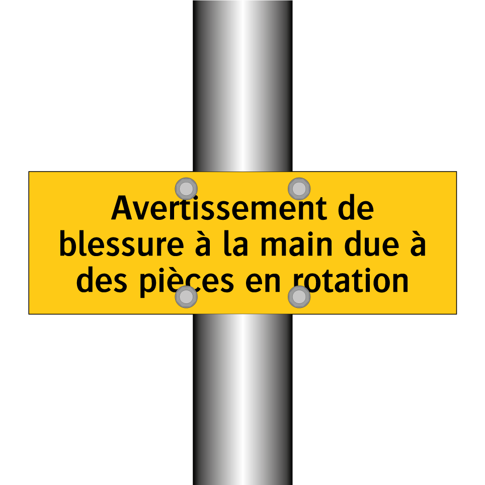 Panneau d'avertissement avec le texte : "Avertissement de blessure à la main due à des pièces en rotation"