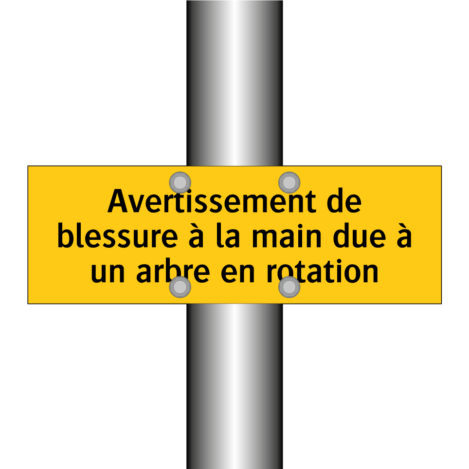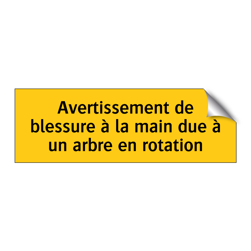 Panneau d'avertissement avec le texte : "Avertissement de blessure à la main due à un arbre en rotation"