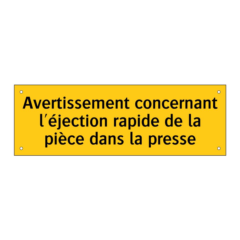 Panneau d'avertissement avec le texte : "Avertissement concernant l'éjection rapide de la pièce dans la presse"
