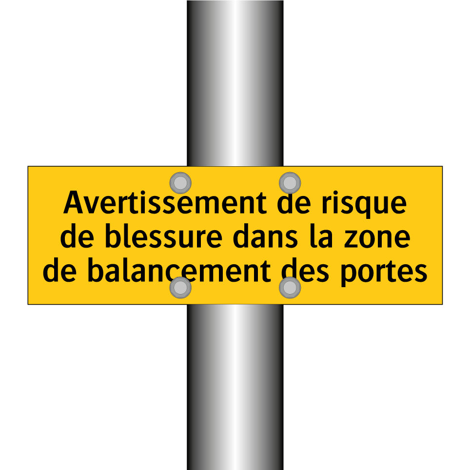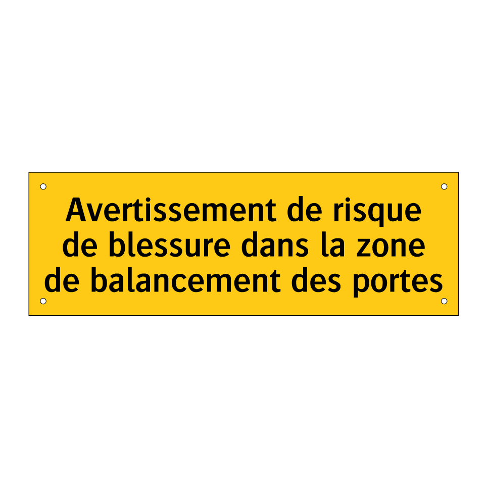 Panneau d'avertissement avec le texte : "Avertissement de risque de blessure dans la zone de balancement des portes"