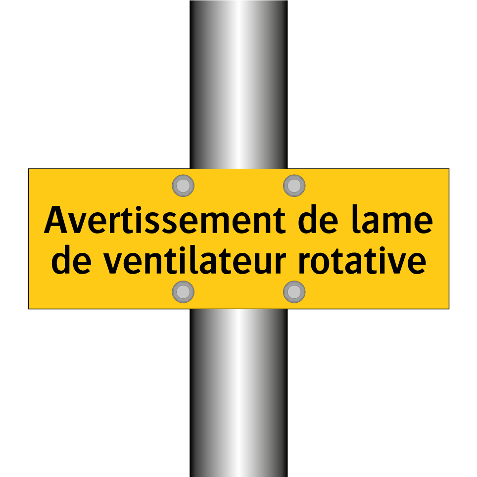 Panneau d'avertissement avec le texte : "Avertissement de lame de ventilateur rotative"