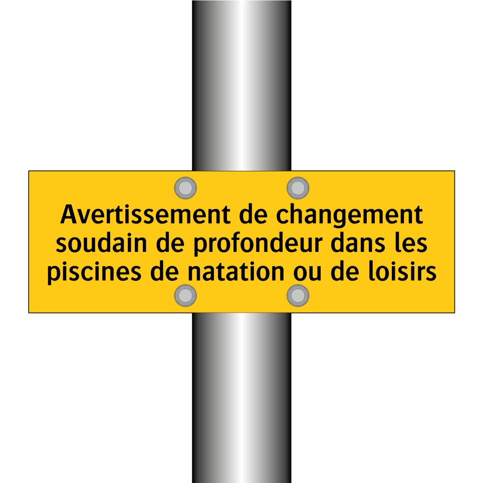 Panneau d'avertissement avec le texte : "Avertissement de changement soudain de profondeur dans les piscines de natation ou de loisirs"