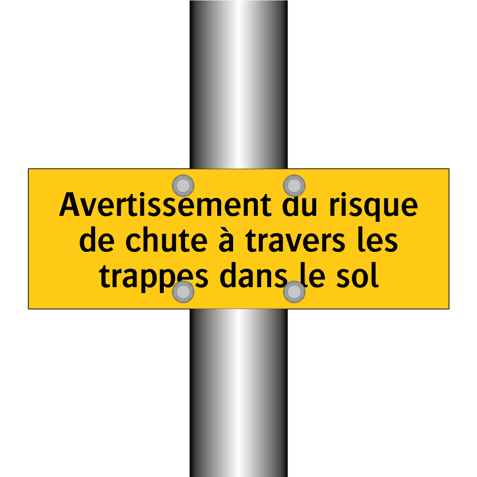 Panneau d'avertissement avec le texte : "Avertissement du risque de chute à travers les trappes dans le sol"